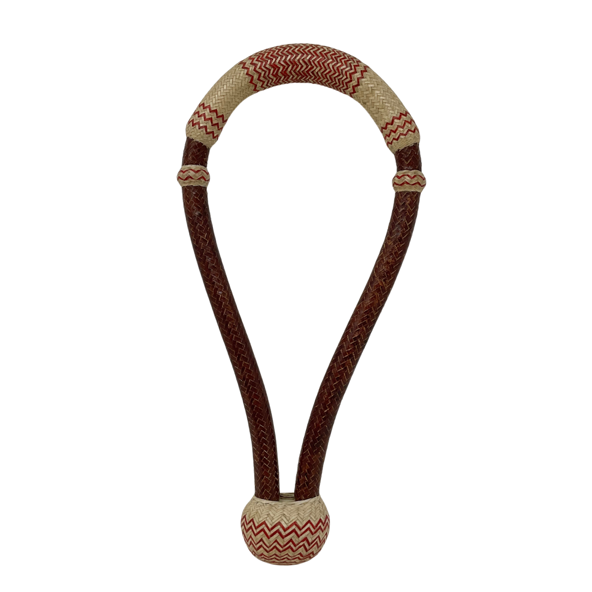 28 plait 5/8" hand braided colored roohide bosal with red accented rawhide noseband and heel knot.