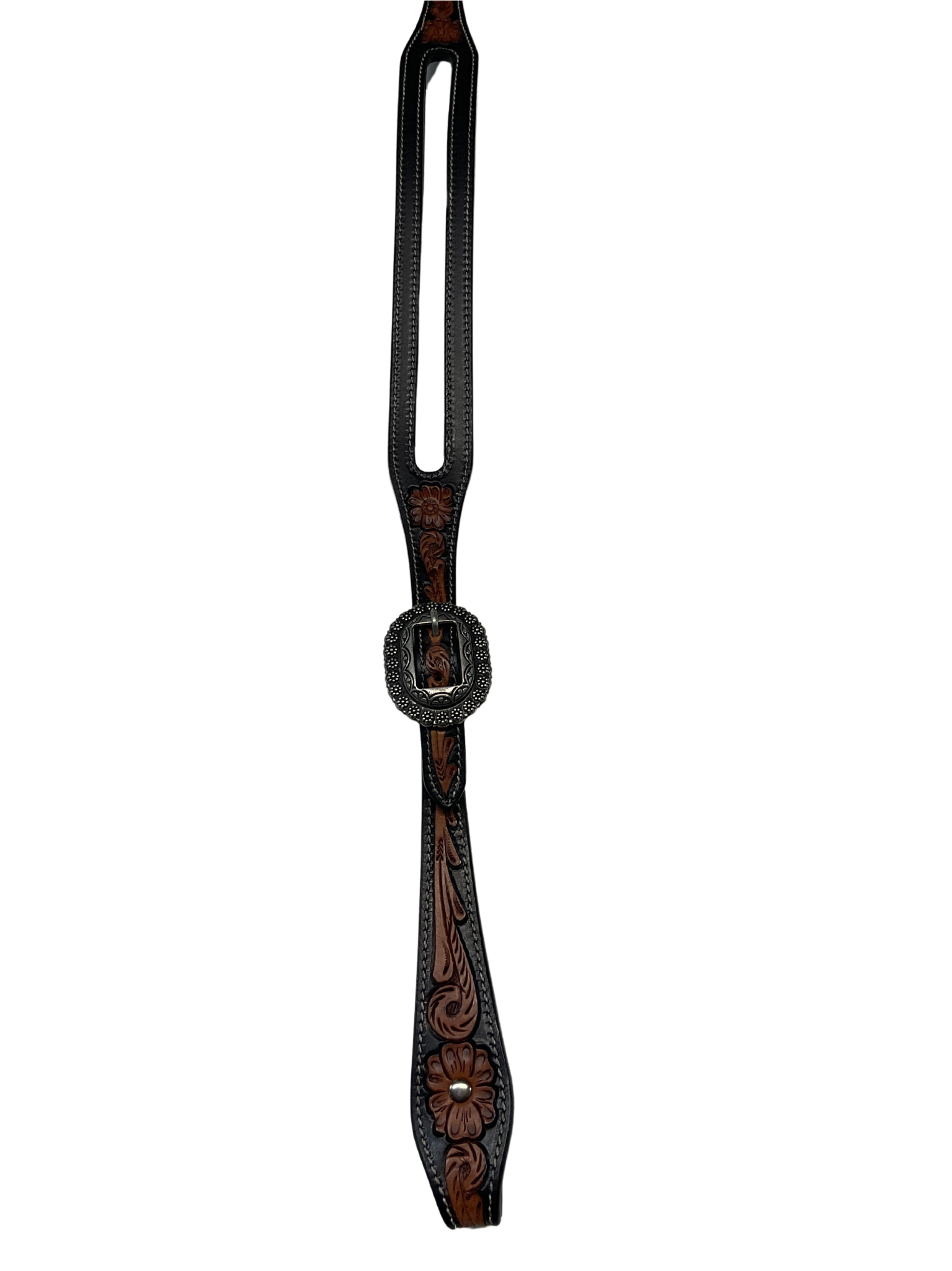 3/4" doubled and stitched shaped split ear headstall with dyed floral carving. It has JWP Horseshoe brand buckles on both sides and chicago screw bit hangers.