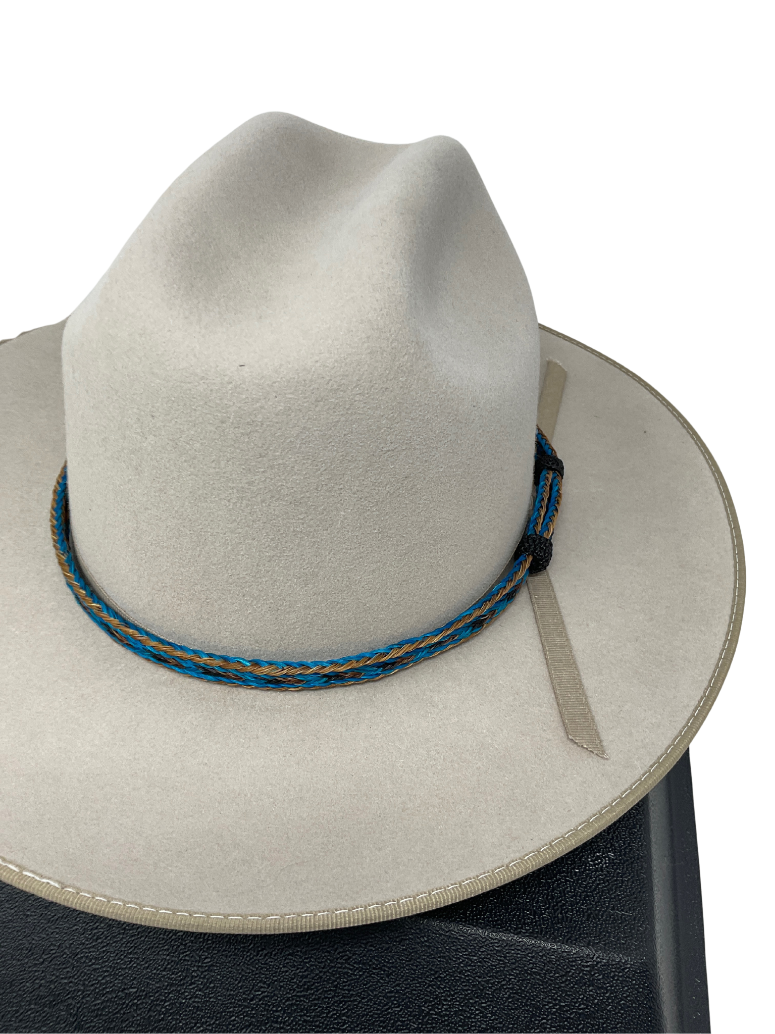 3/8" wide turqouise and sorrel colored horsehair adjustable hat band with 2 knots.