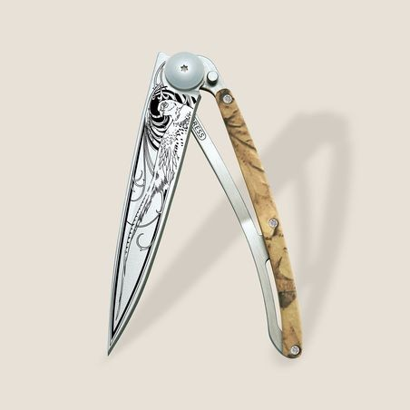 Ultra-light knife in Z40C13 stainless steel, black titanium finish. Blade with secure liner lock system decorated with fine laser engraving. Belt clip. Printed Aluminium handle.