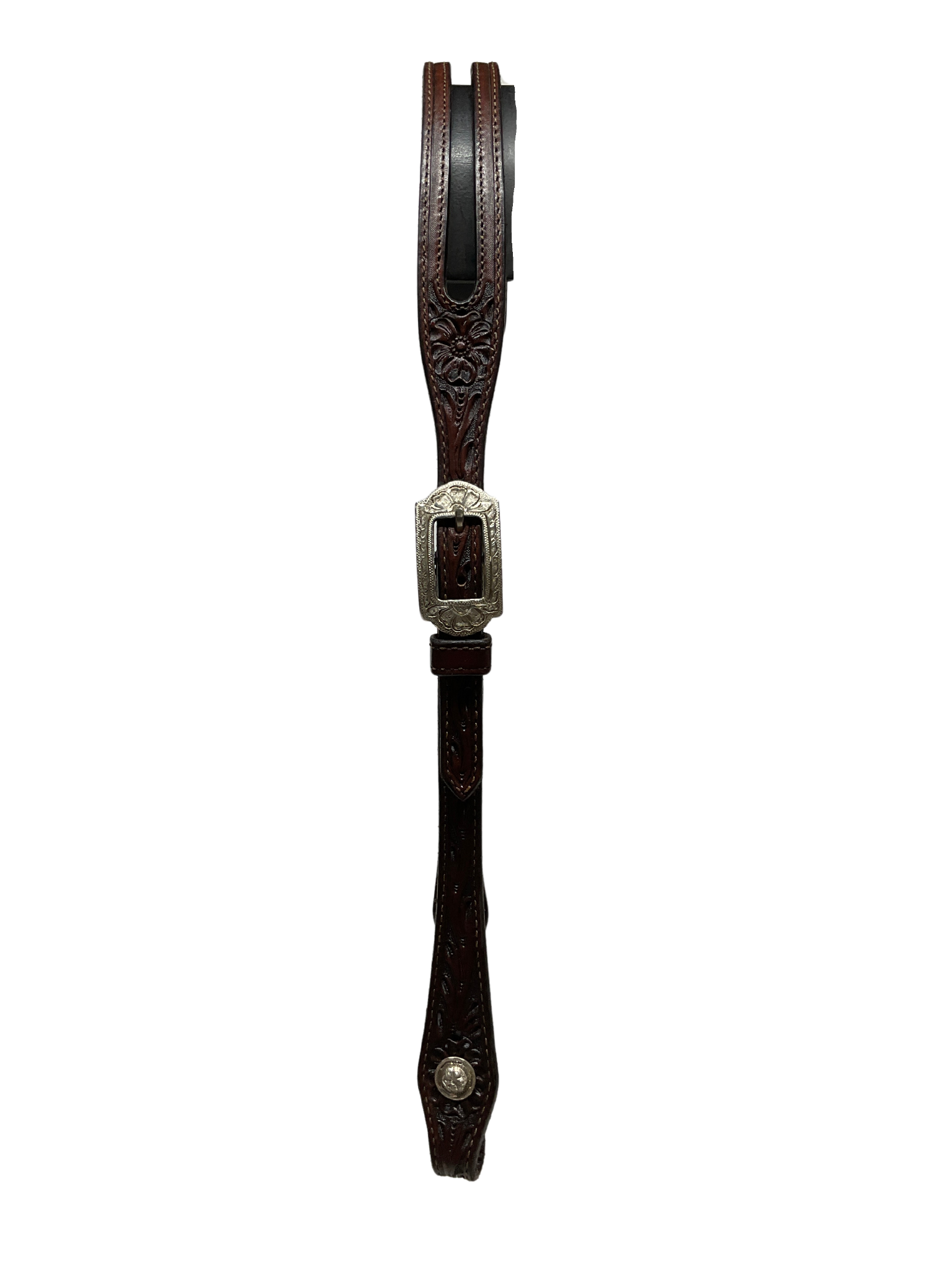 5/8" dark shaped split ear floral carved headstall with sterling silver buckles on both sides and Chicago screw bit hangers.