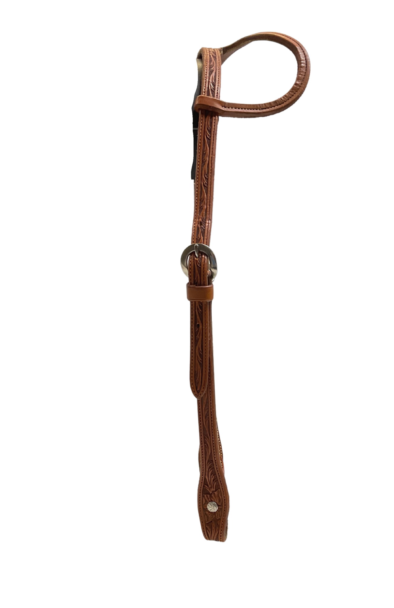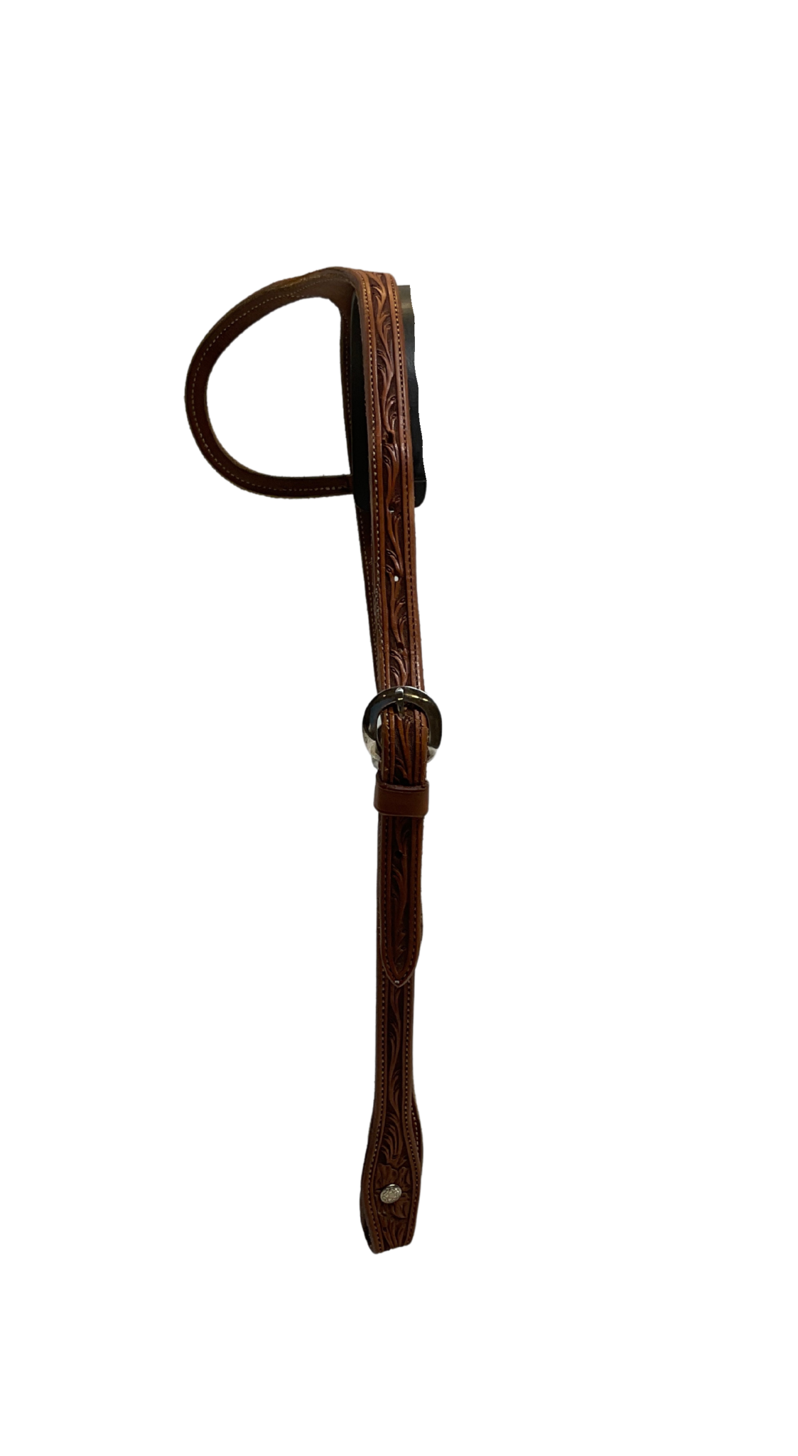 5/8" doubled and stitched floral carved single ear headstall. It has stainless buckles on both sides and chicago screw bit hangers.