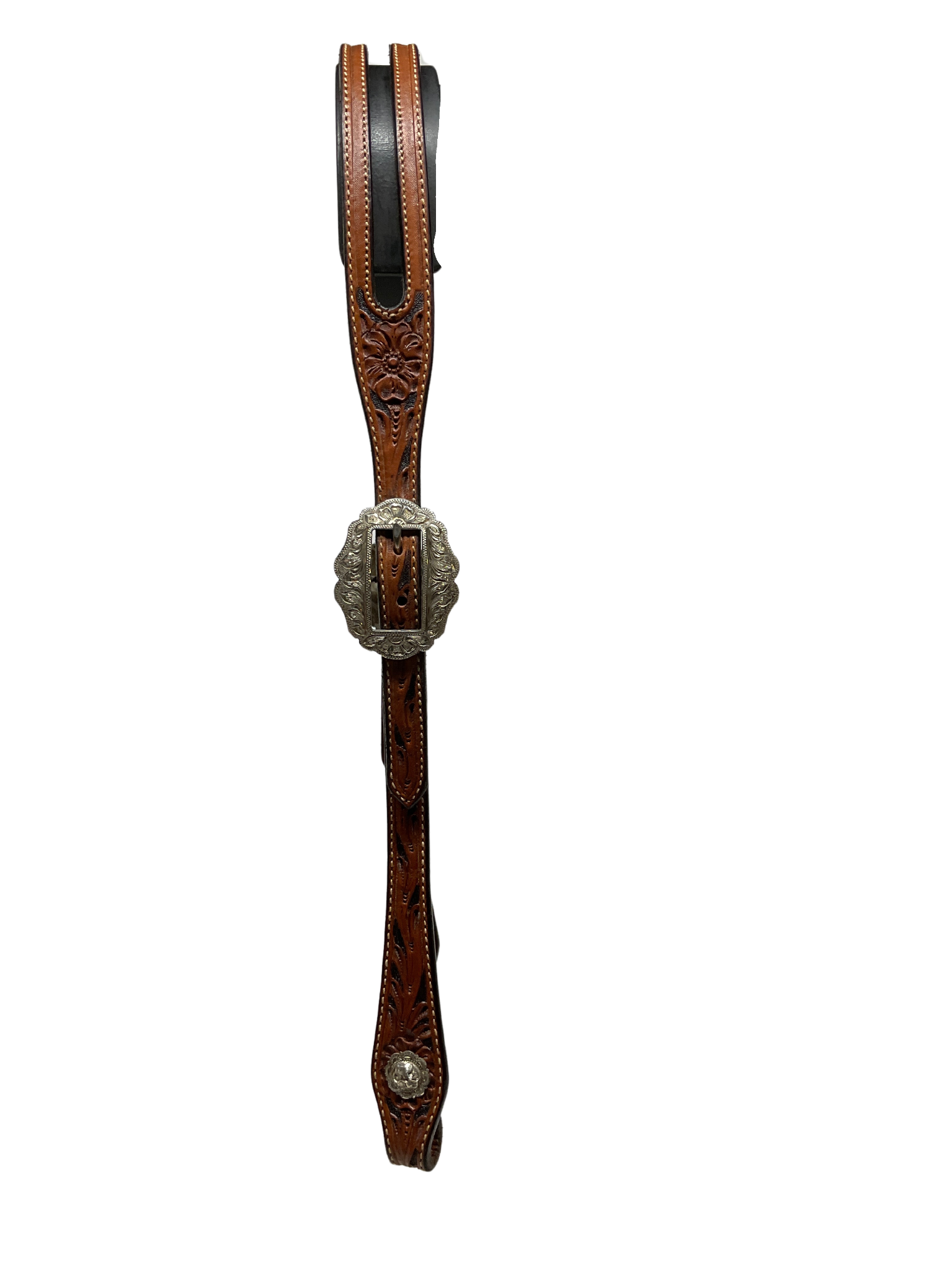 5/8" shaped split ear floral carved headstall with sterling silver buckles on both sides and Chicago screw bit hangers.