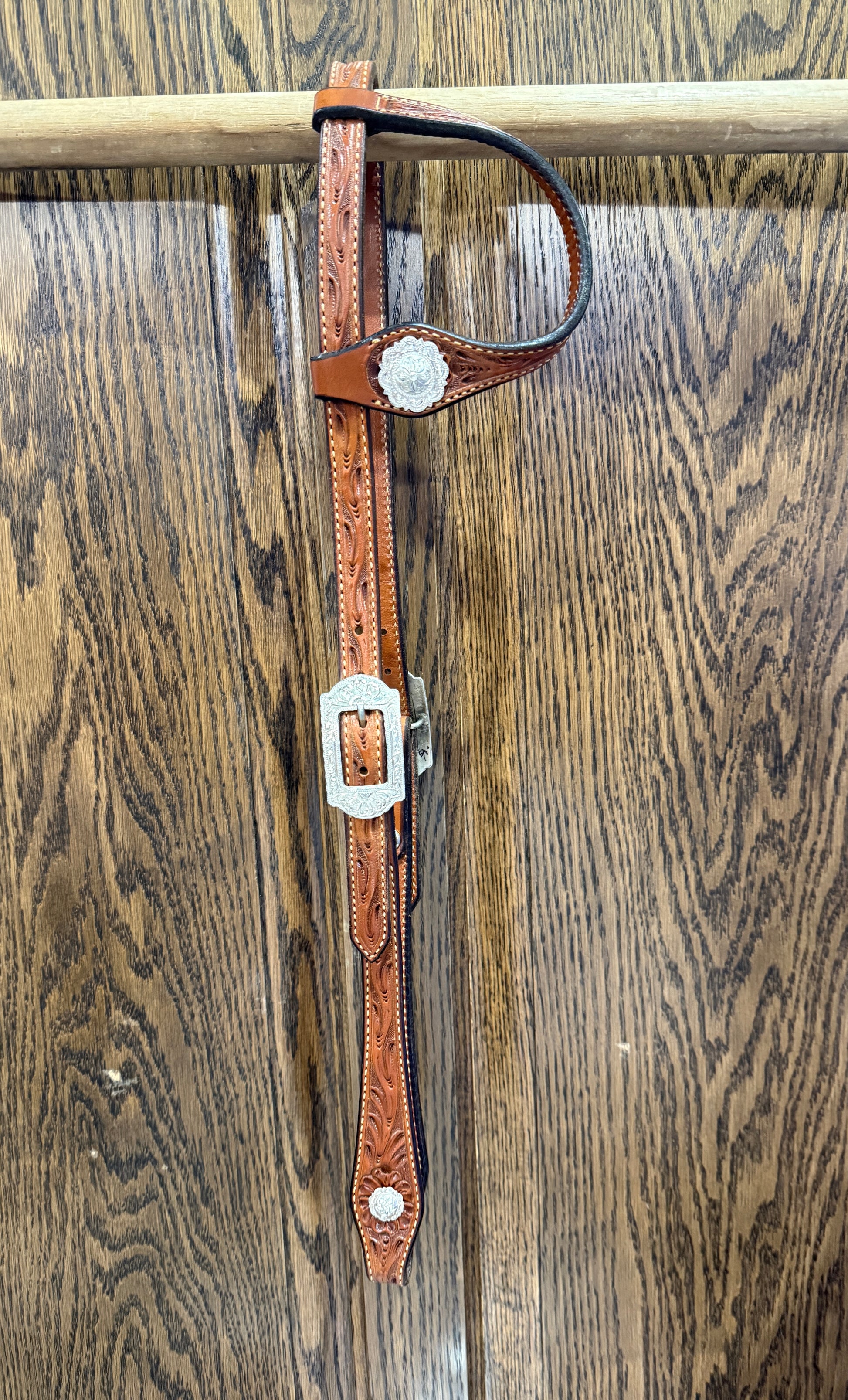 5/8" shaped split ear floral carved headstall with sterling silver buckles and conchos