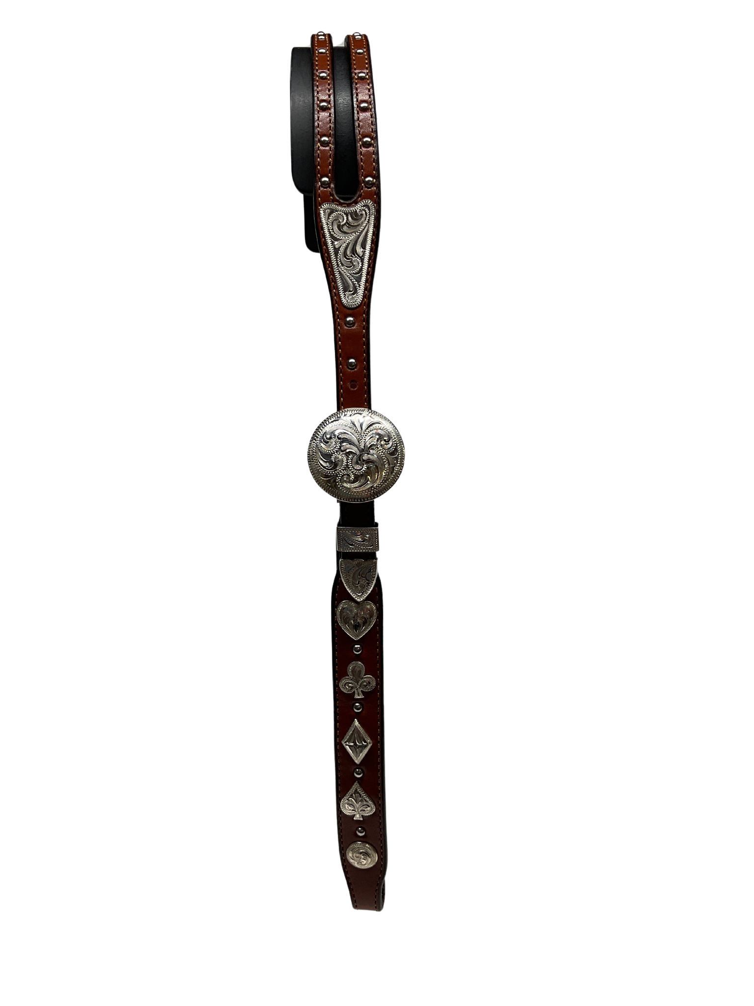 Simple yet elegant leather shaped split ear headstall with Hansen Oakdale concho buckles, loops and tips on both sides, an ear arrow, dots on the crown piece, card suit conchos down the cheek pieces and chicago screw bit hangers. Available in dark or light variations.