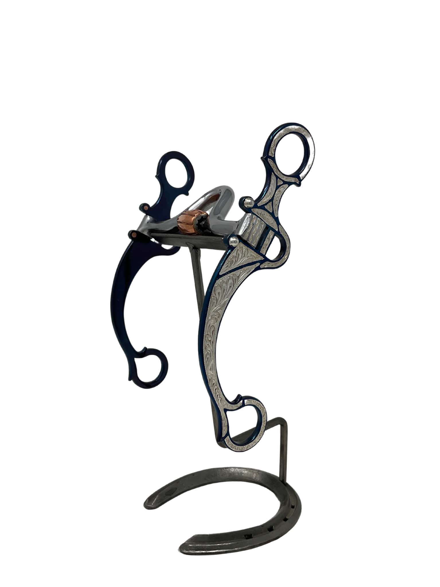 Blued finish with inlaid sterling silver, no slobber bar or chains, and flared cheeks. Our standard mouthpiece width is 5 1/8″. For custom bit orders please click on B/B Silver Bits-Custom orders