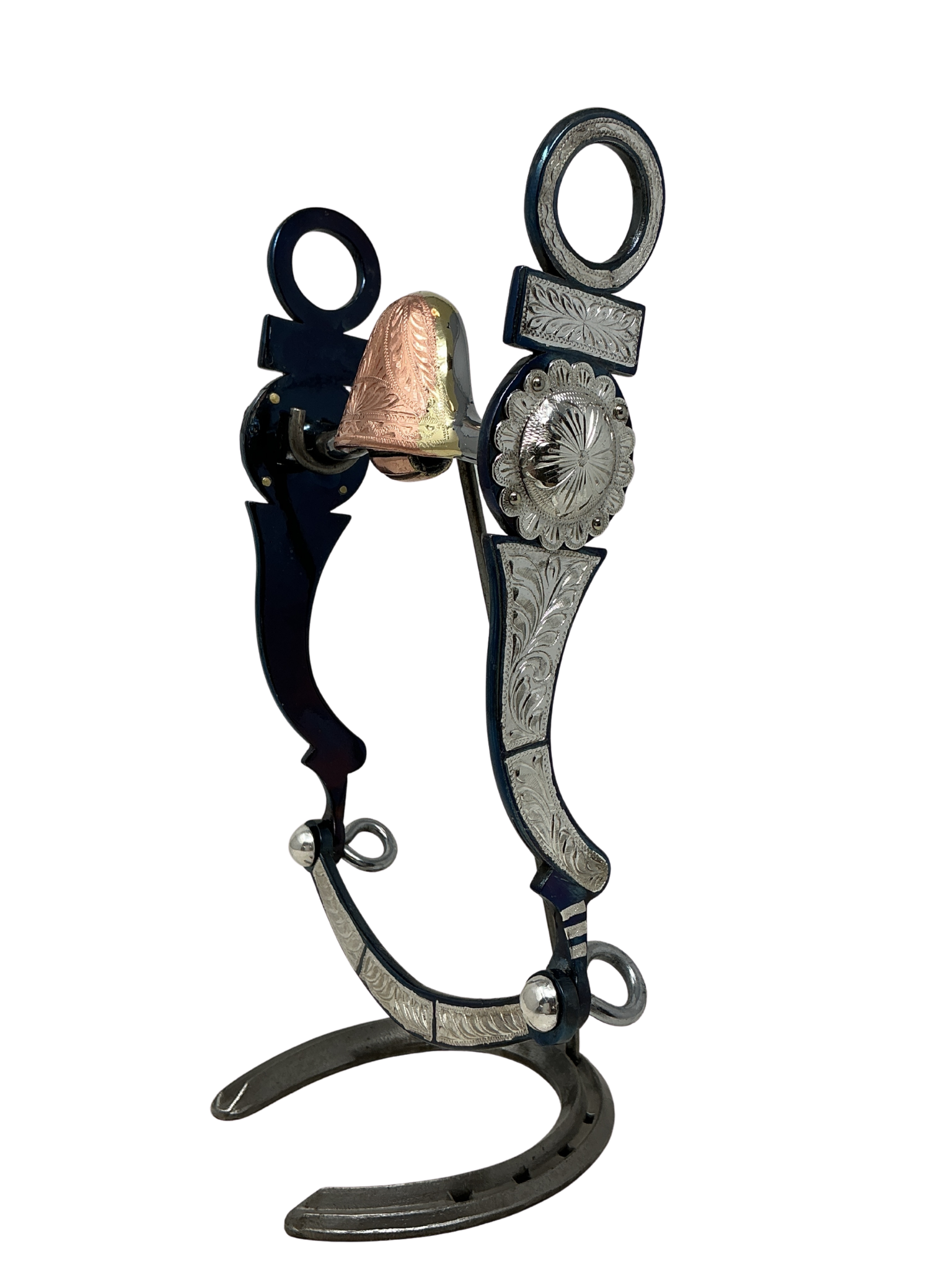 Blue finish with inlaid sterling silver, slobber bar, and flared cheeks. Our standard mouthpiece width is 5 1/8″. For custom bit orders please click on B/B Silver Bits-Custom orders