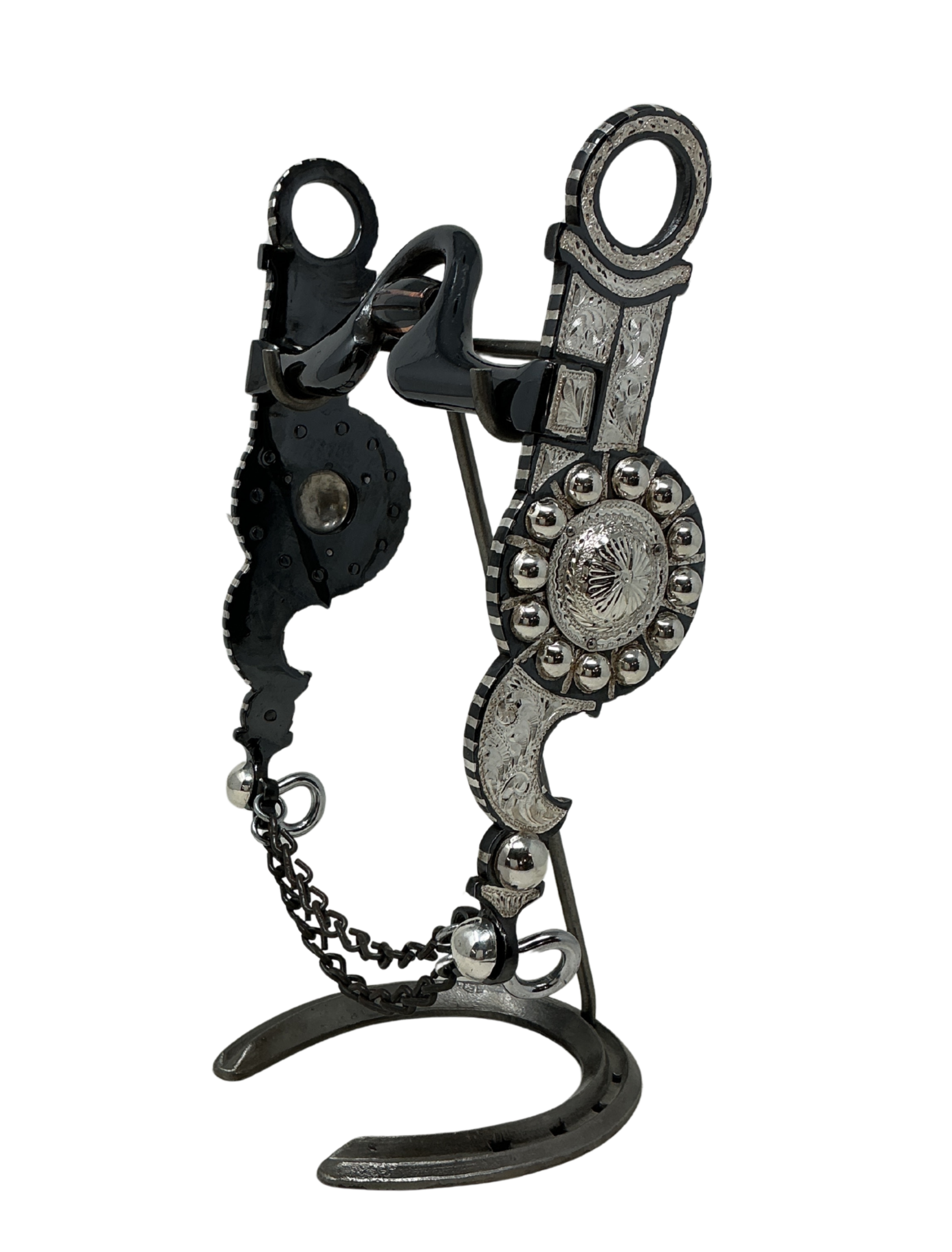 Black finish with inlaid sterling silver, slobber chains and flared cheeks. Our standard mouthpiece width is 5 1/8″. For custom bit orders please click on B/B Silver Bits-Custom orders