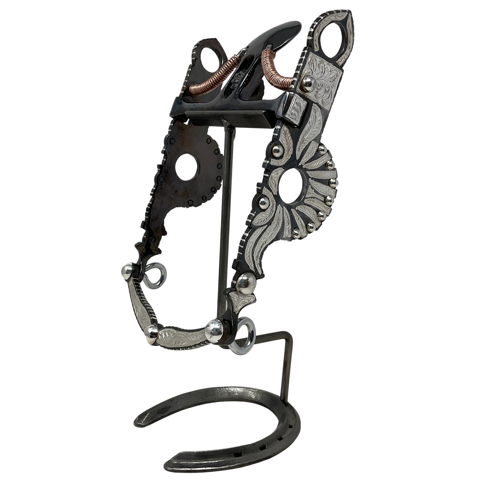 Black finish with inlaid sterling silver, slobber bar, and flared cheeks. Our standard mouthpiece width is 5 1/8″. For custom bit orders please click on B/B Silver Bits-Custom orders