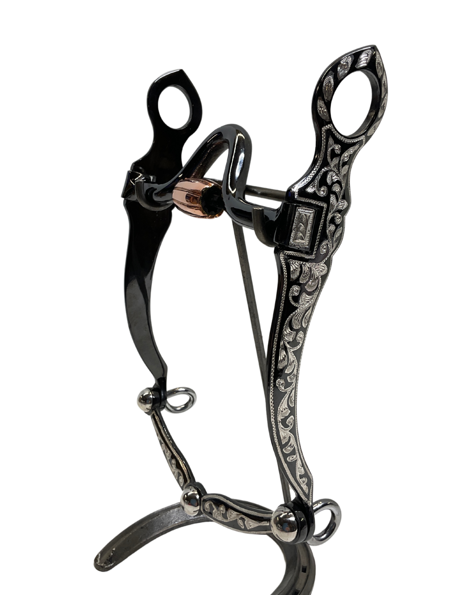 Black finish with inlaid sterling silver, slobber bar, and flared cheeks. Our standard mouthpiece width is 5 1/8″. For custom bit orders please click on B/B Silver Bits-Custom orders.