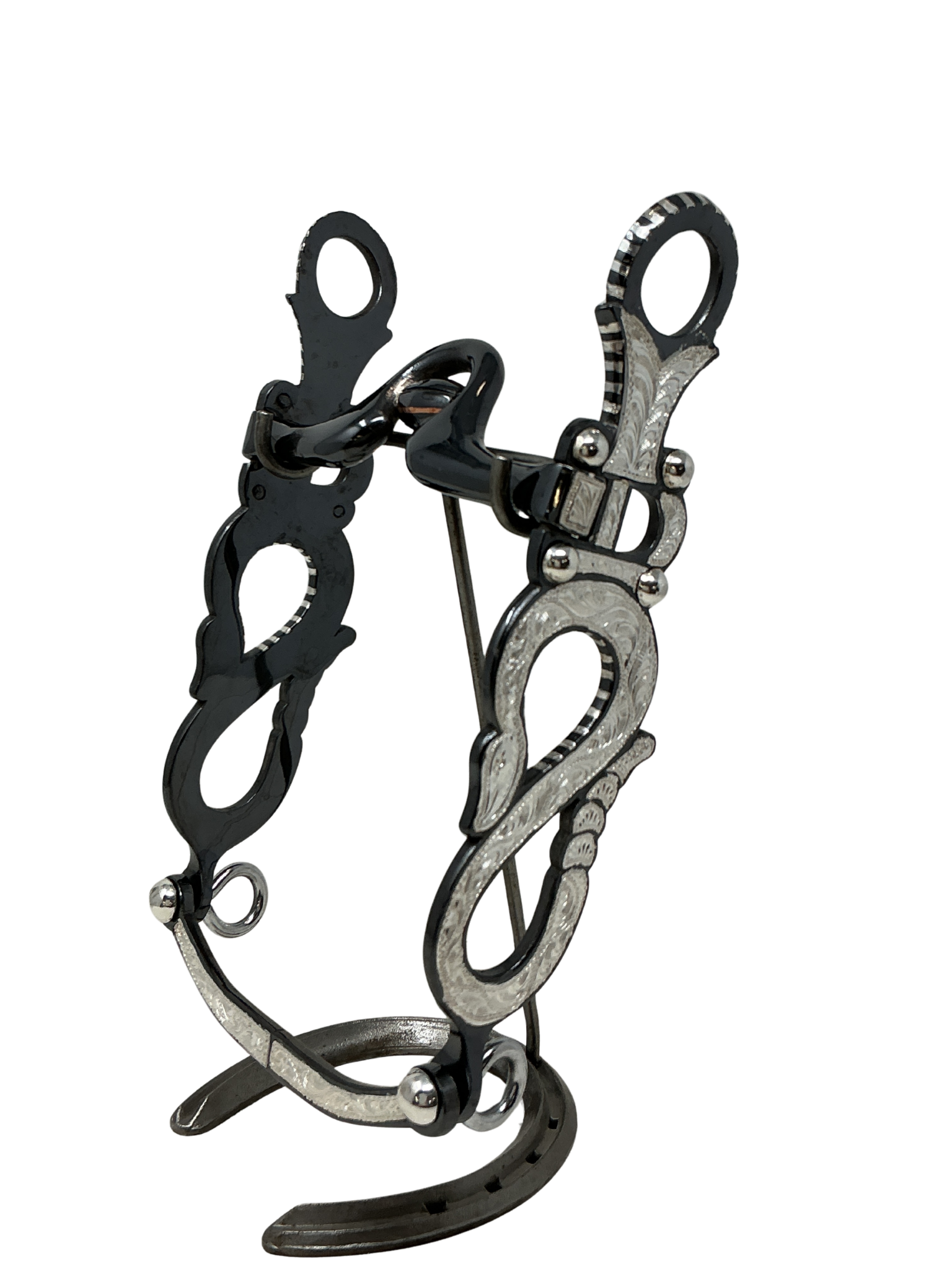 Black finish with inlaid sterling silver, slobber chains, and flared cheeks. Our standard mouthpiece width is 5 1/8″. For custom bit orders please click on B/B Silver Bits-Custom orders.