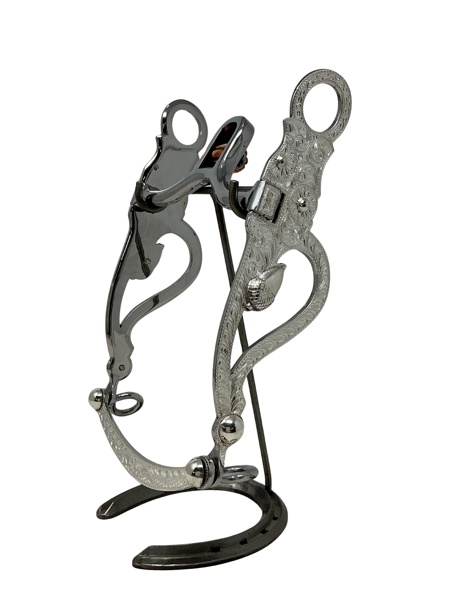 Stainless finish with overlaid sterling silver, a slobber bar and flared cheeks. Our standard mouthpiece width is 5 1/8″. For custom bit orders please click on B/B Silver Bits-Custom orders
