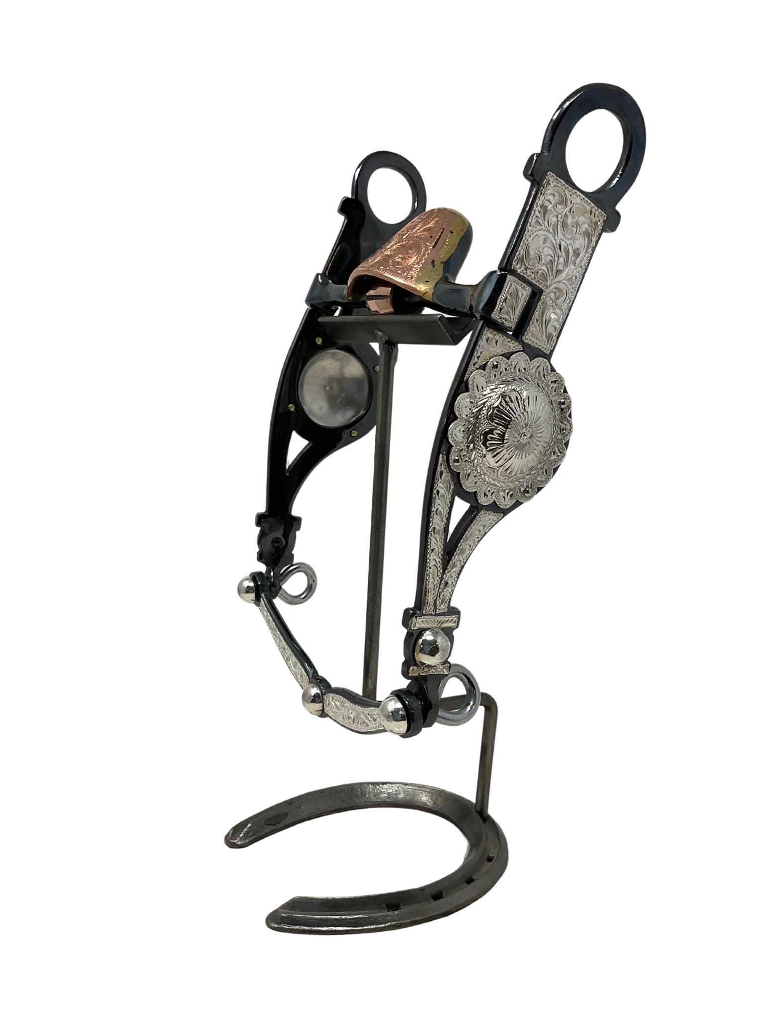 Black finish with inlaid sterling silver, slobber bar, and flared cheeks. Our standard mouthpiece width is 5 1/8″. For custom bit orders please click on B/B Silver Bits-Custom orders