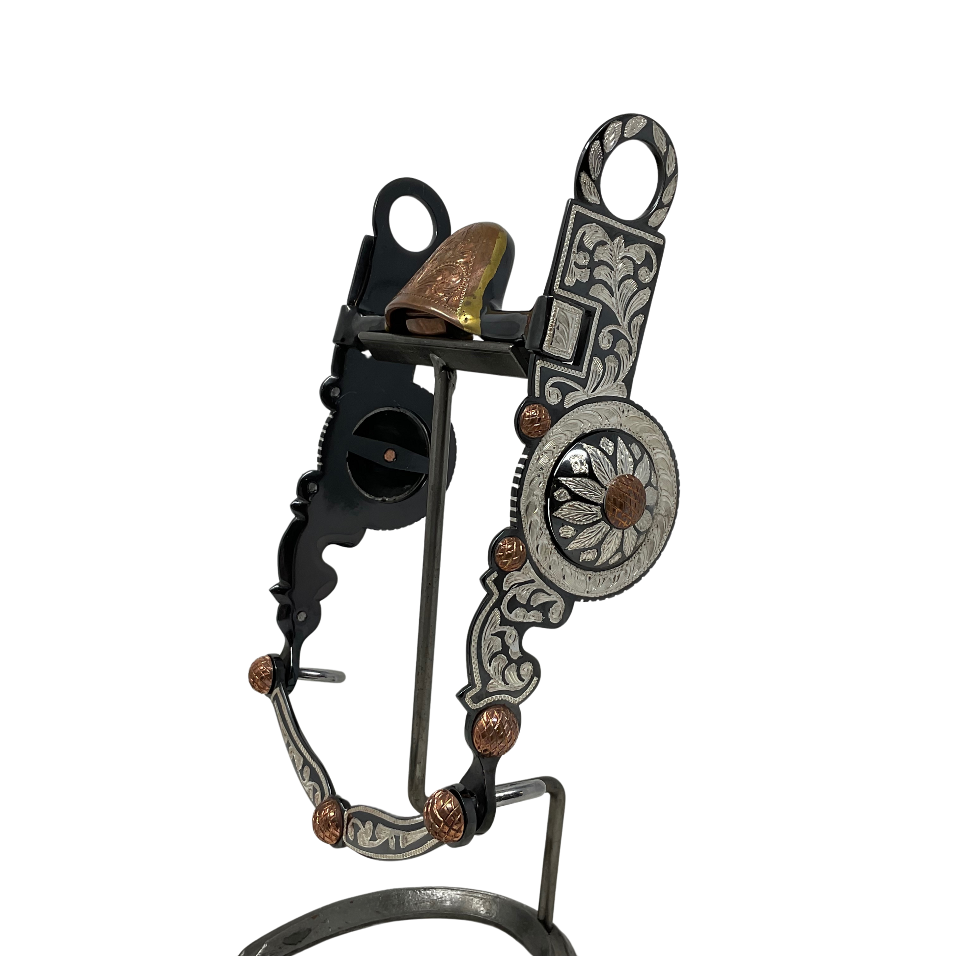 Black finish with inlaid sterling silver, slobber bar, and flared cheeks. Our standard mouthpiece width is 5 1/8″. For custom bit orders please click on B/B Silver Bits-Custom orders.