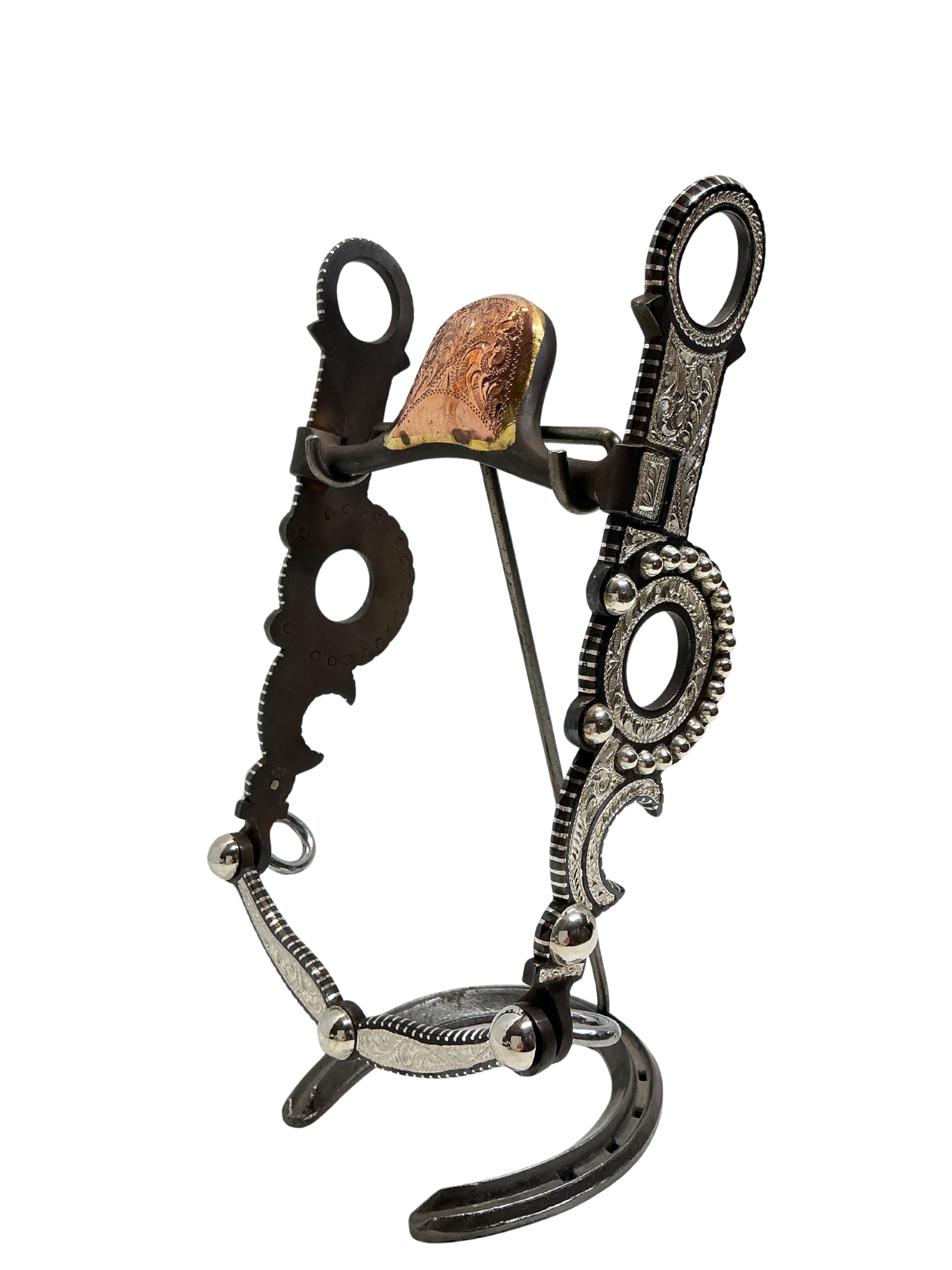 Rust finish with inlaid sterling silver, slobber bar and flared cheeks. Our standard mouthpiece width is 5 1/8″. For custom bit orders please click on B/B Silver Bits-Custom orders