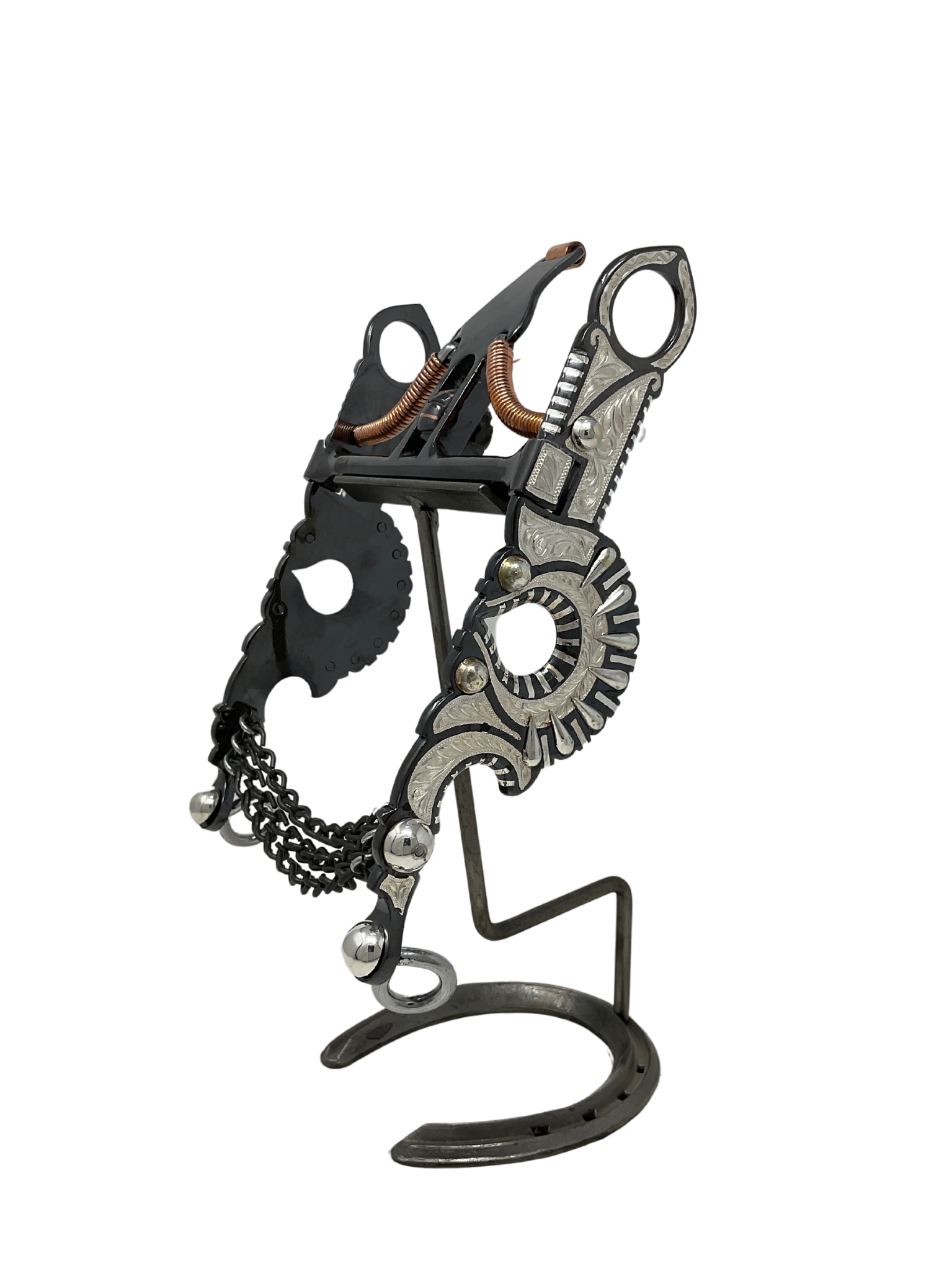 Black finish with inlaid sterling silver, slobber chains, and flared cheeks. Our standard mouthpiece width is 5 1/8". For custom orders, please click on B/B Silver Bits- Custom Orders.