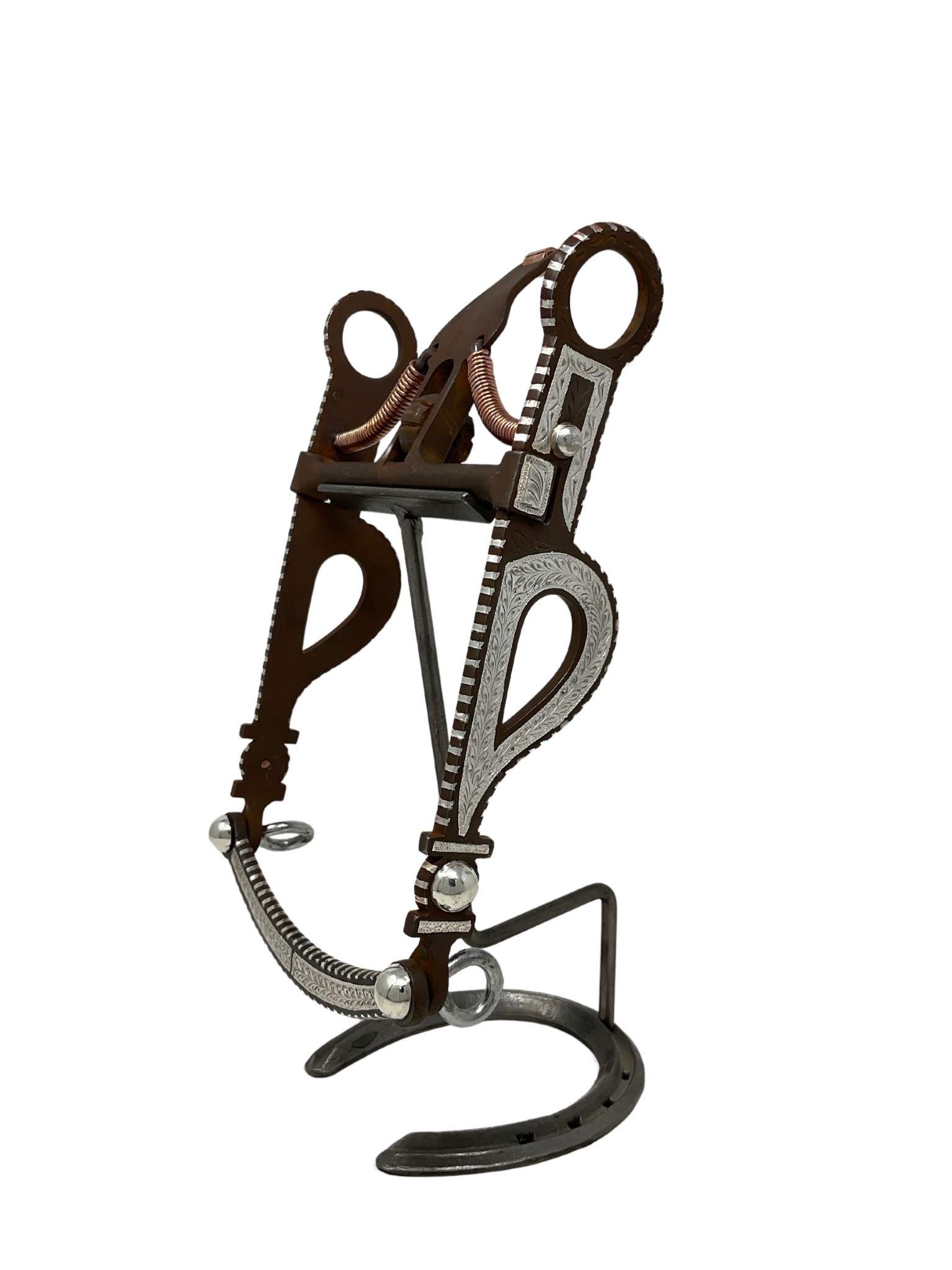 Rust finish with inlaid sterling silver, slobber bar, and flared cheeks. Our standard mouthpiece width is 5 1/8″. For custom bit orders please click on B/B Silver Bits-Custom orders