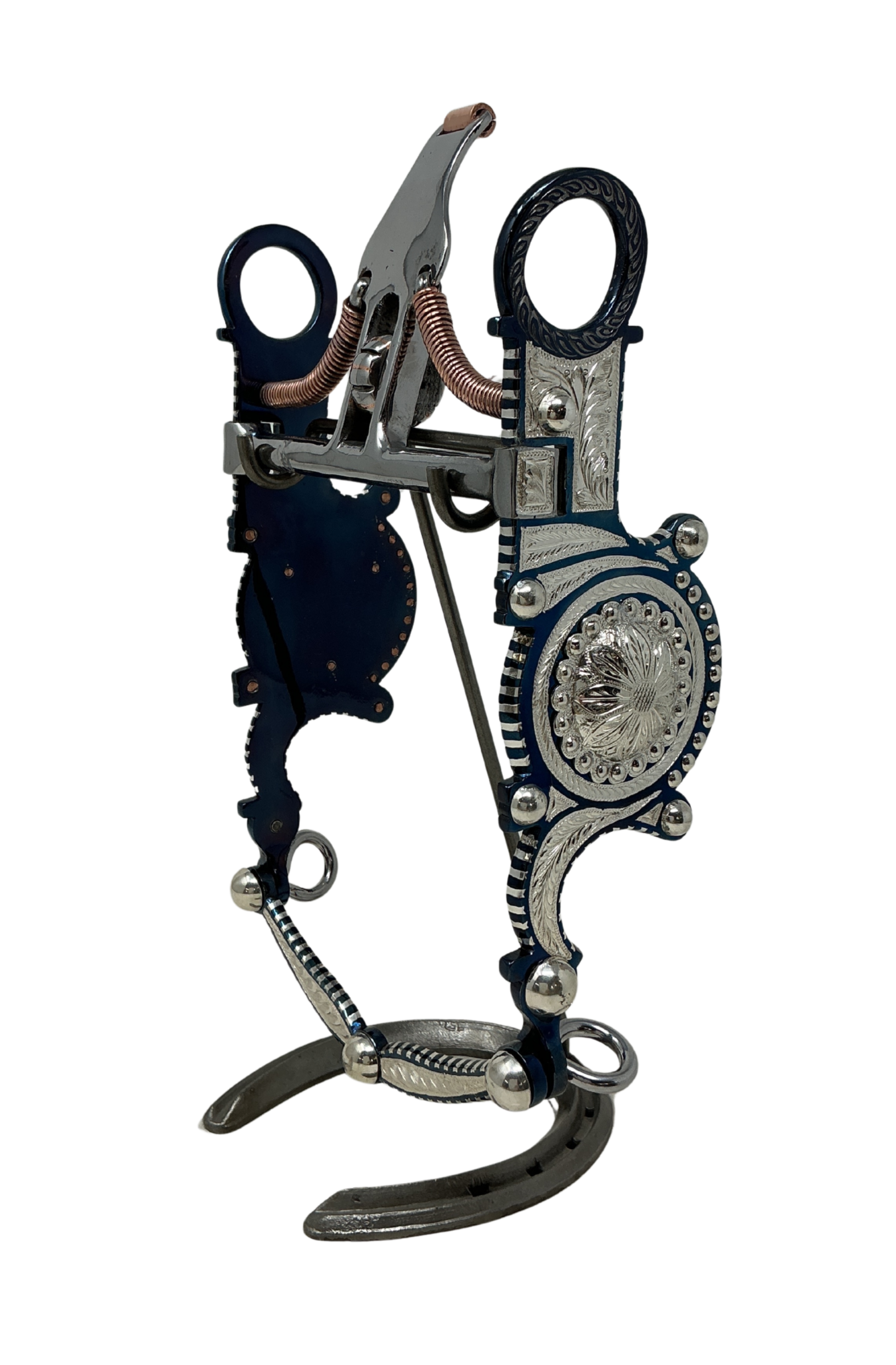 Blue finish with inlaid sterling silver, slobber bar and flared cheeks. Our standard mouthpiece width is 5 1/8″. For custom bit orders please click on B/B Silver Bits-Custom orders