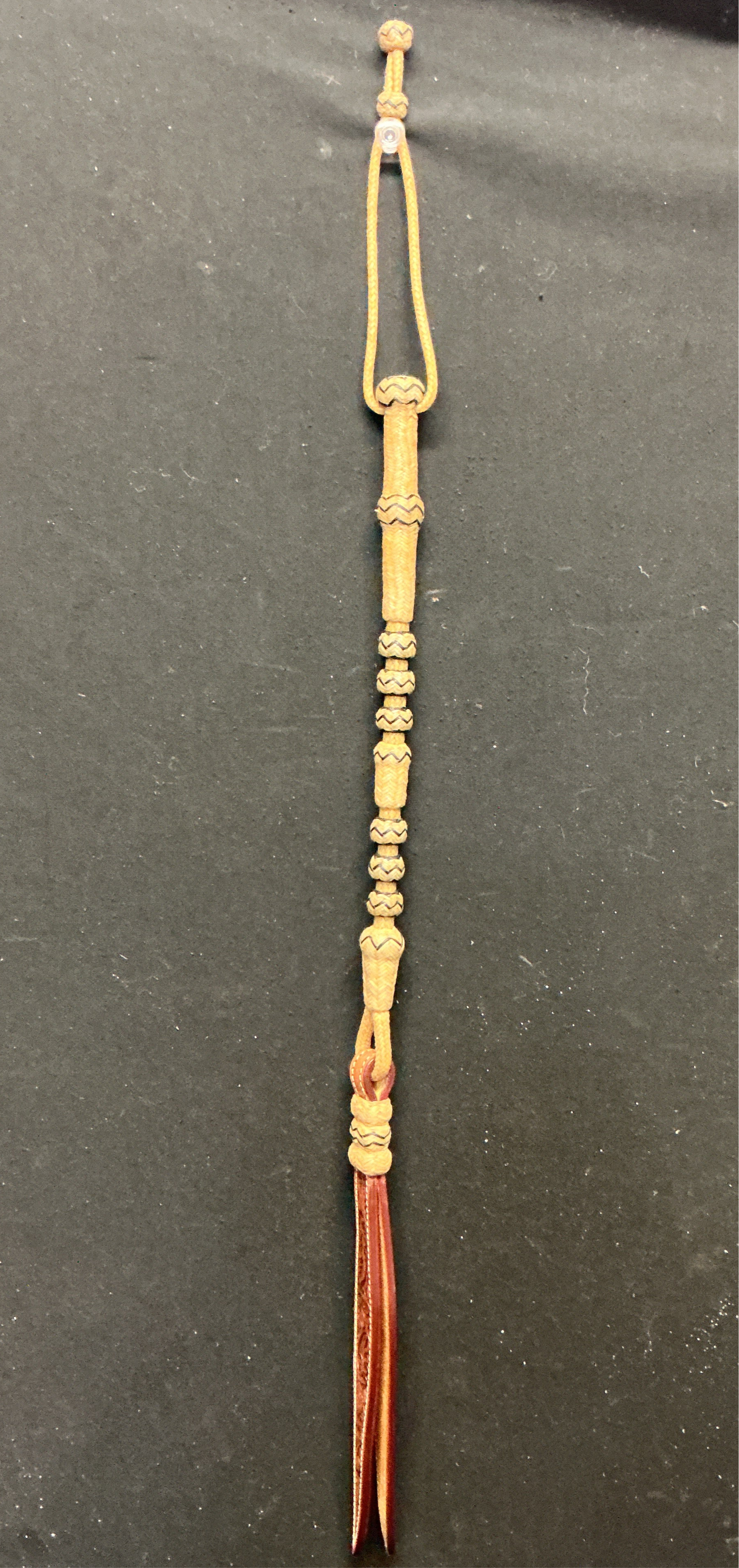 54 plait hand braided accented rawhide quirt. 15" in length.