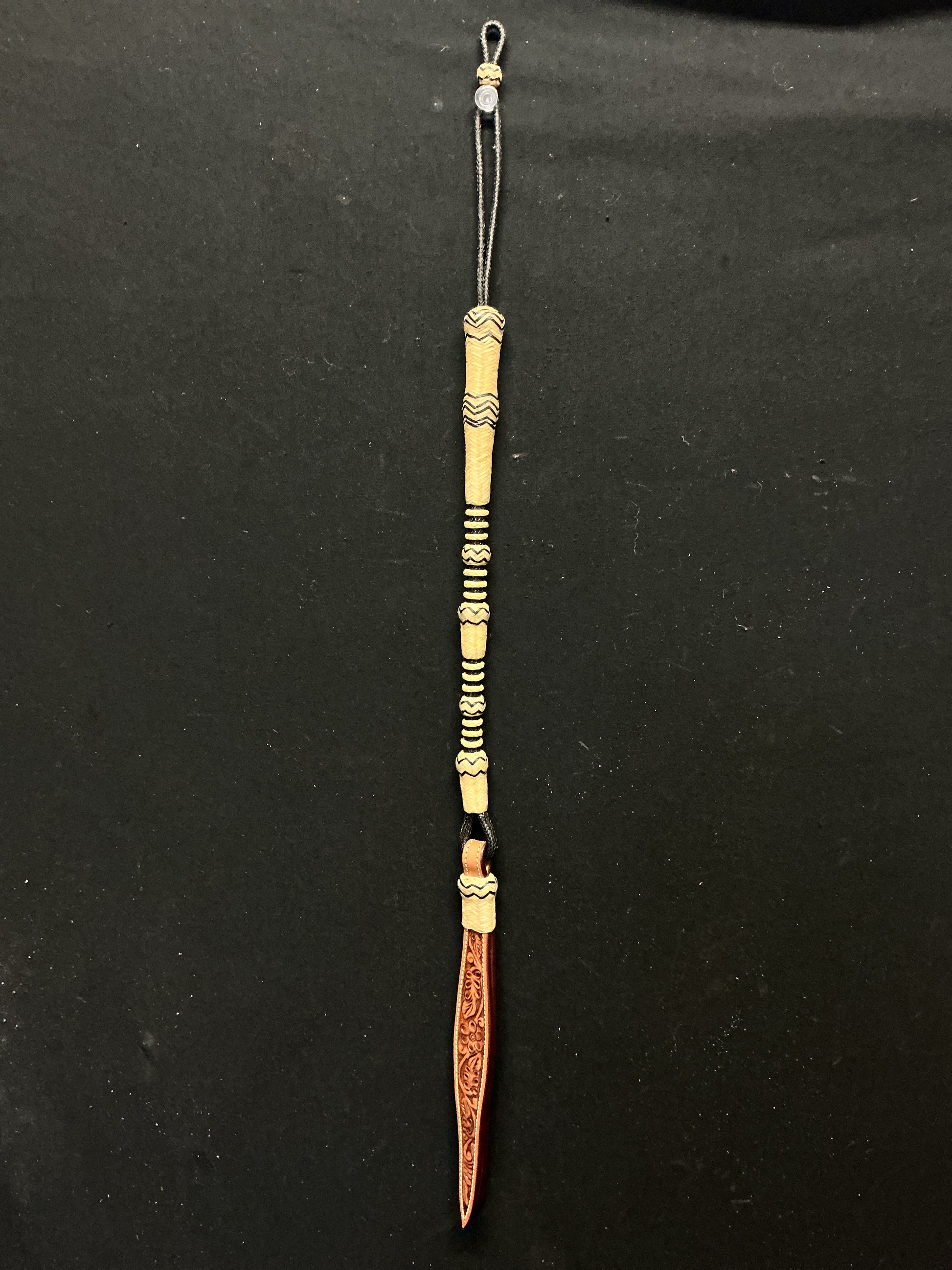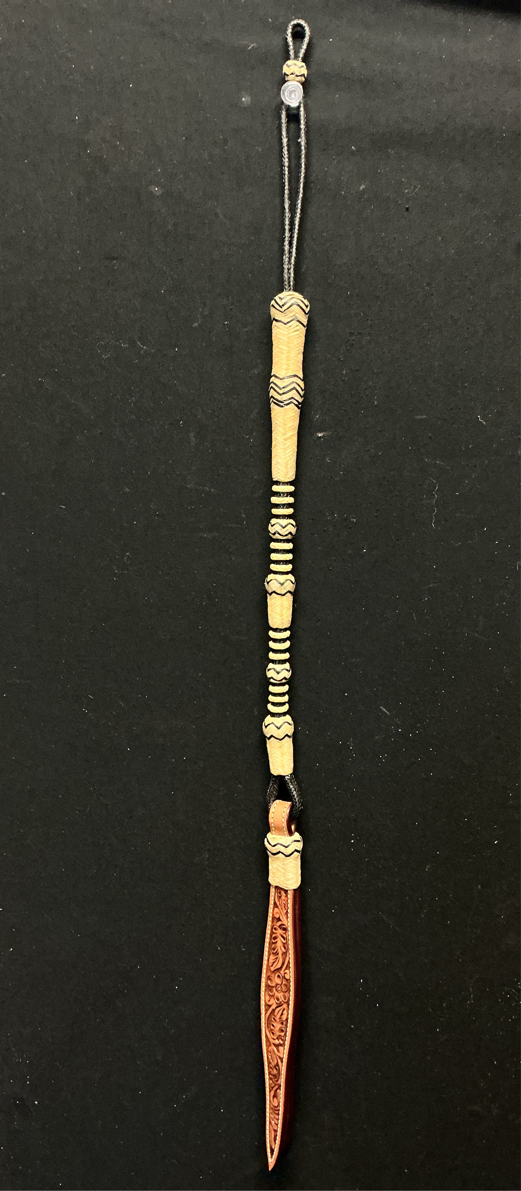 54 plait hand braided Black and natural rawhide quirt. 15" in length.