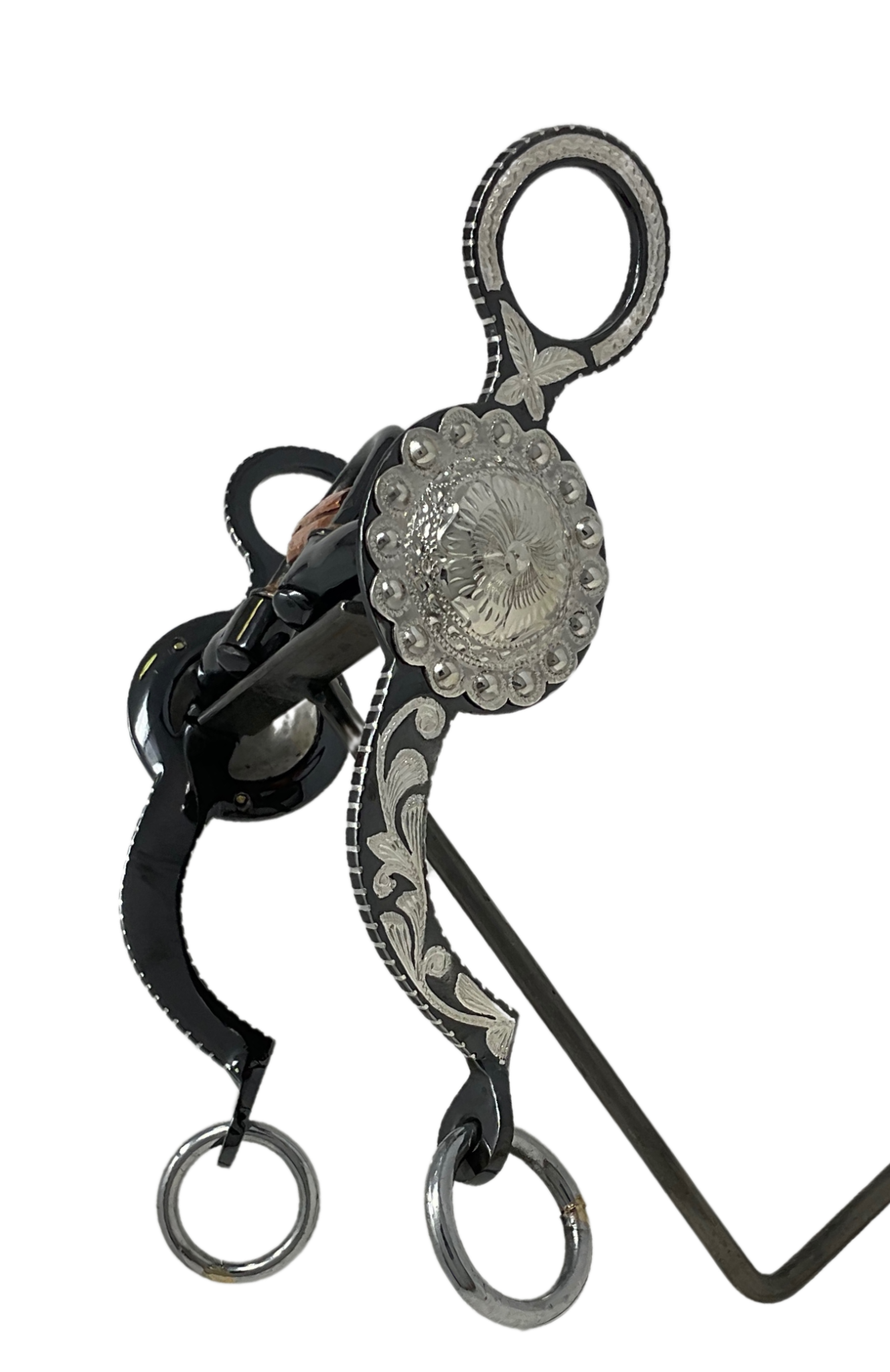 Black finish with inlaid sterling silver and flared cheeks. Our standard mouthpiece width is 5 1/8″. For custom bit orders please click on B/B Silver Bits-Custom orders
