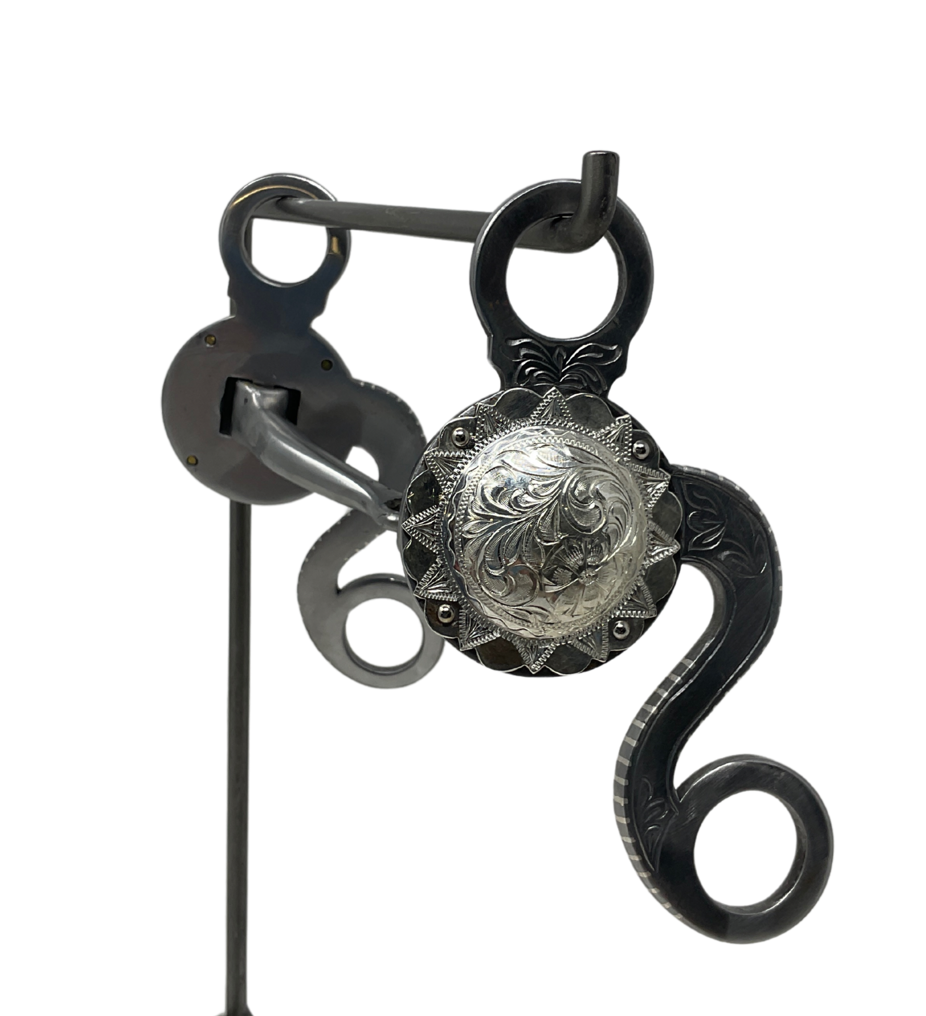 Stainless finish with inlaid sterling silver, flared cheeks and silver conchos. Our standard mouthpiece width is 5 1/8″. For custom bit orders please click on B/B Silver Bits-Custom orders