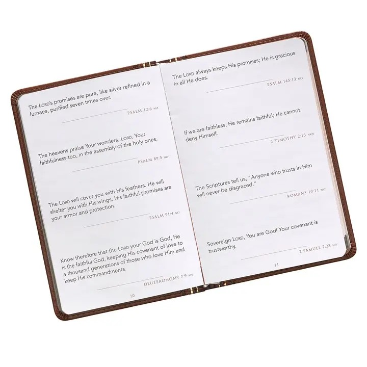God's Word is full of vital information to help us live successfully in our relationship with God and others. Promises from God for Every Man Two-tone Brown Faux Leather Promise Book will give the guys you love a shortcut to finding guidance, strength, and power from the Bible. Two-tone brown cover with gold-foiled accents, Faux leather, Flexcover, Gold-foiled title, Presentation page, Full-color interior, White ribbon marker, 232 gilt-edged pages, Size: 7.3" x 4.8" x 0.5"