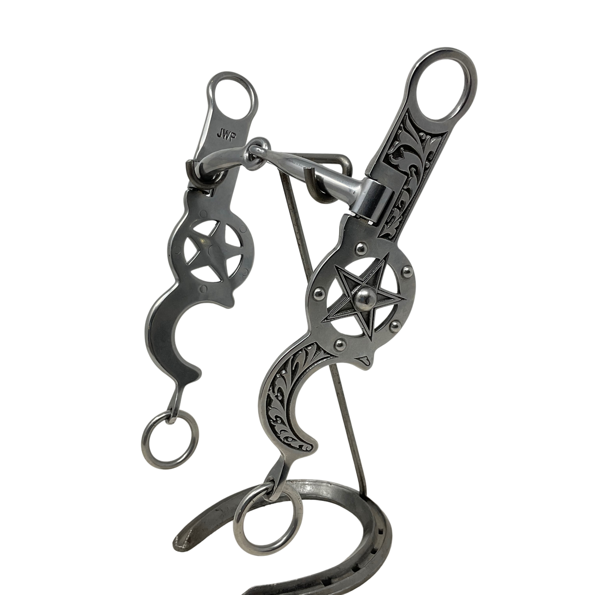 AC-1200- Horse Bit.- length is 7.5" Snaffle Mouth- All stainless cheeks with assorted floral and geometric design motifs, are combined with sweet iron mouthpieces each of which are meticulously inlaid with copper. This line of horse bits appears to be silver mounted from only a short distance away. Each cheek is designed in such a way that the cheeks find a natural balance in the rider’s hand, sending a clear soft signal to the horse.