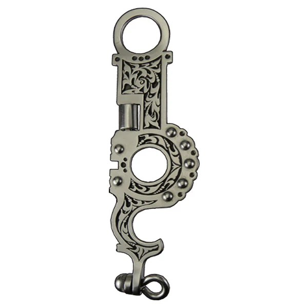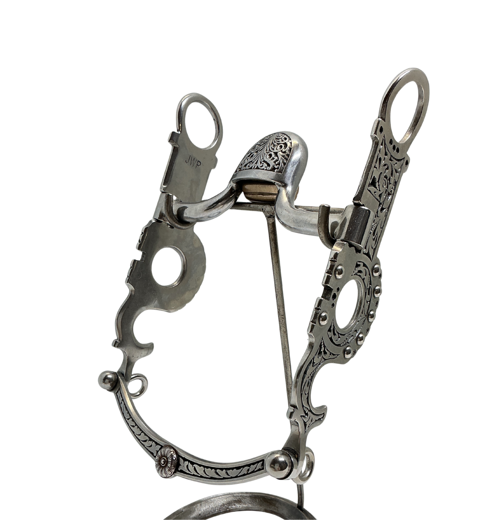 AC-400- Horse Bit with 2 1/4" tall hooded port with roller. - 7.25 length - All stainless cheeks with assorted floral and geometric design motifs, are combined with sweet iron mouthpieces each of which are meticulously inlaid with copper. This line of horse bits appears to be silver mounted from only a short distance away. Each cheek is designed in such a way that the cheeks find a natural balance in the rider’s hand, sending a clear soft signal to the horse.
