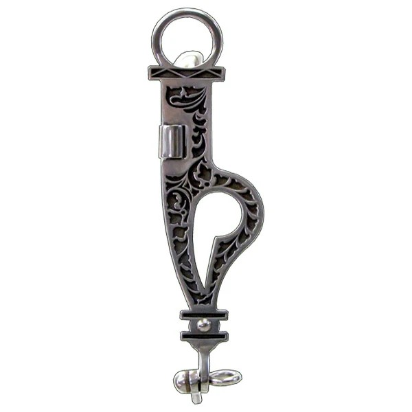 AC-900- Horse Bit with 1 3/4" tall, hinged port. - 7.5" length- All stainless cheeks with assorted floral and geometric design motifs, are combined with sweet iron mouthpieces each of which are meticulously inlaid with copper. This line of horse bits appears to be silver mounted from only a short distance away. Each cheek is designed in such a way that the cheeks find a natural balance in the rider’s hand, sending a clear soft signal to the horse.