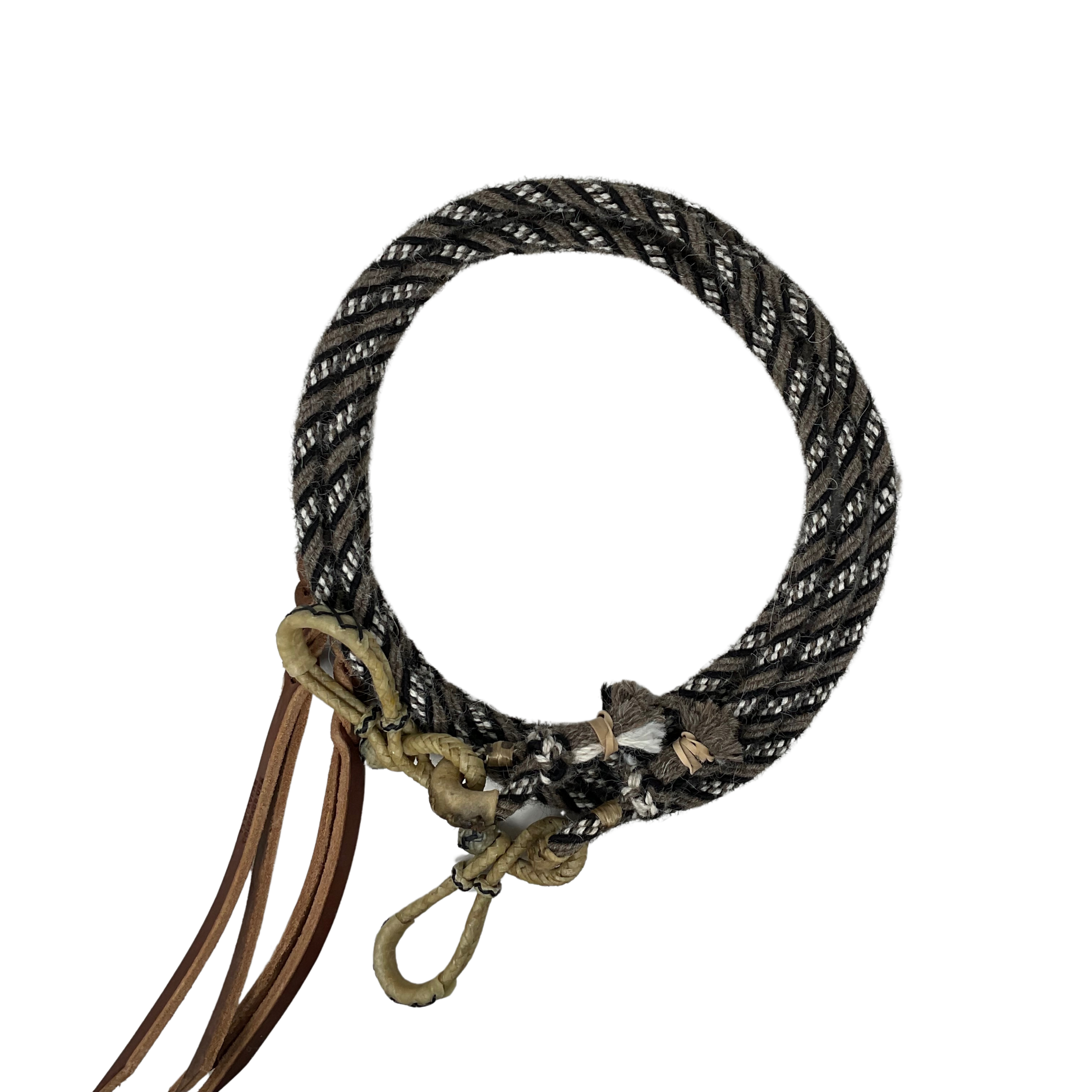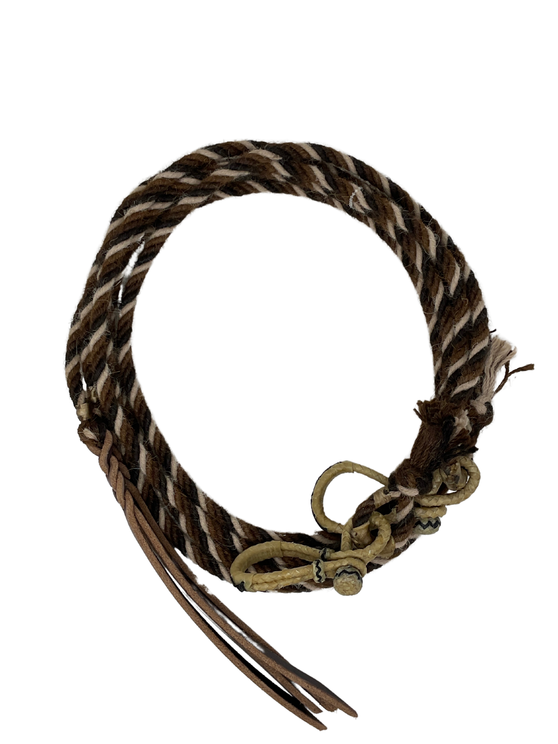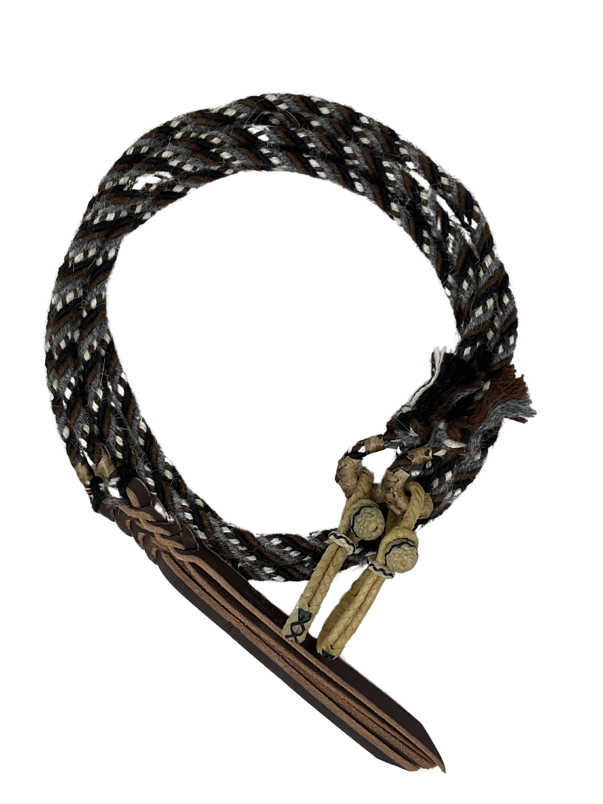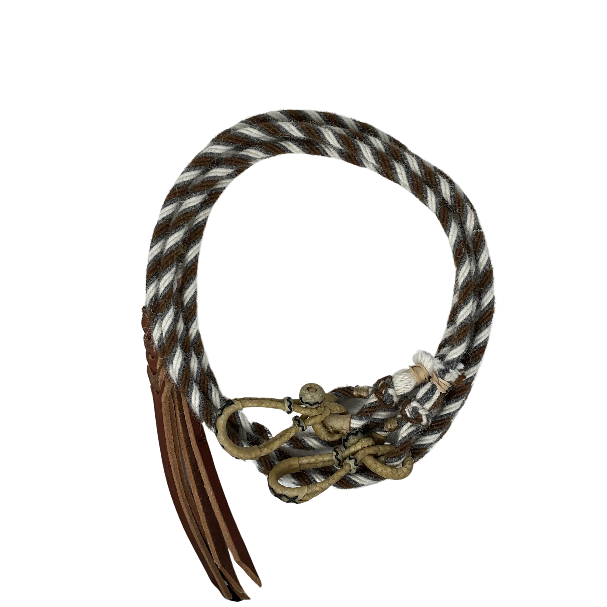3/8" x 8' 4 strand 100% Alpaca split rein with rawhide rein connectors and leather poppers. Available in several different color combinations.