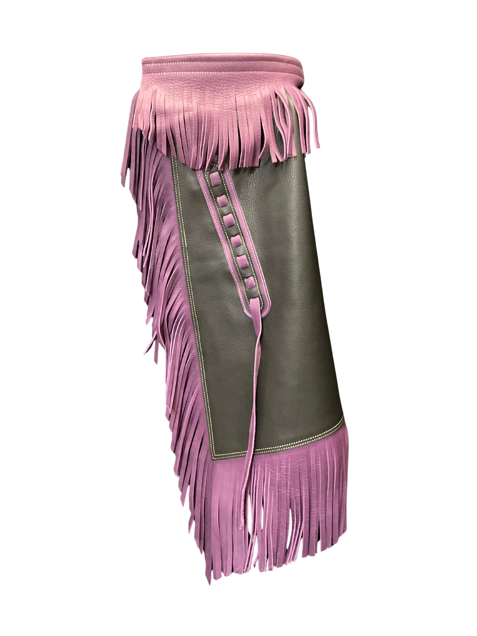 Superior quality, custom made B/B Armitas. Each pair is custom made here in Montana with premier leather. High quality USA made buckle on the back of the belt. 3 straps buckle around the thigh to hold them in place.