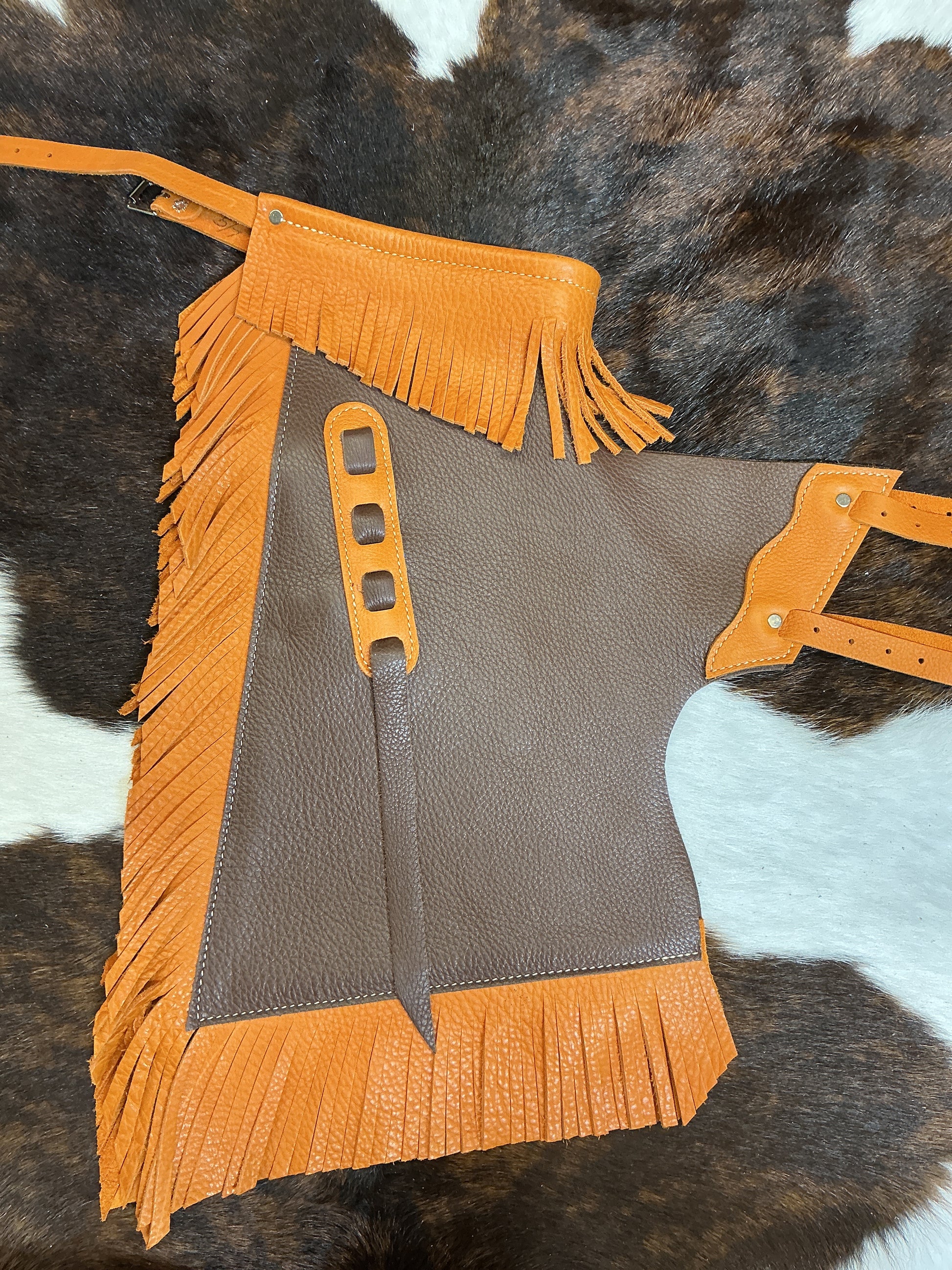 Superior quality, custom made B/B Armitas. Each pair is custom made here in Montana with premier leather. High quality USA made buckle on the back of the belt. 2 straps buckle around the thigh to hold them in place.