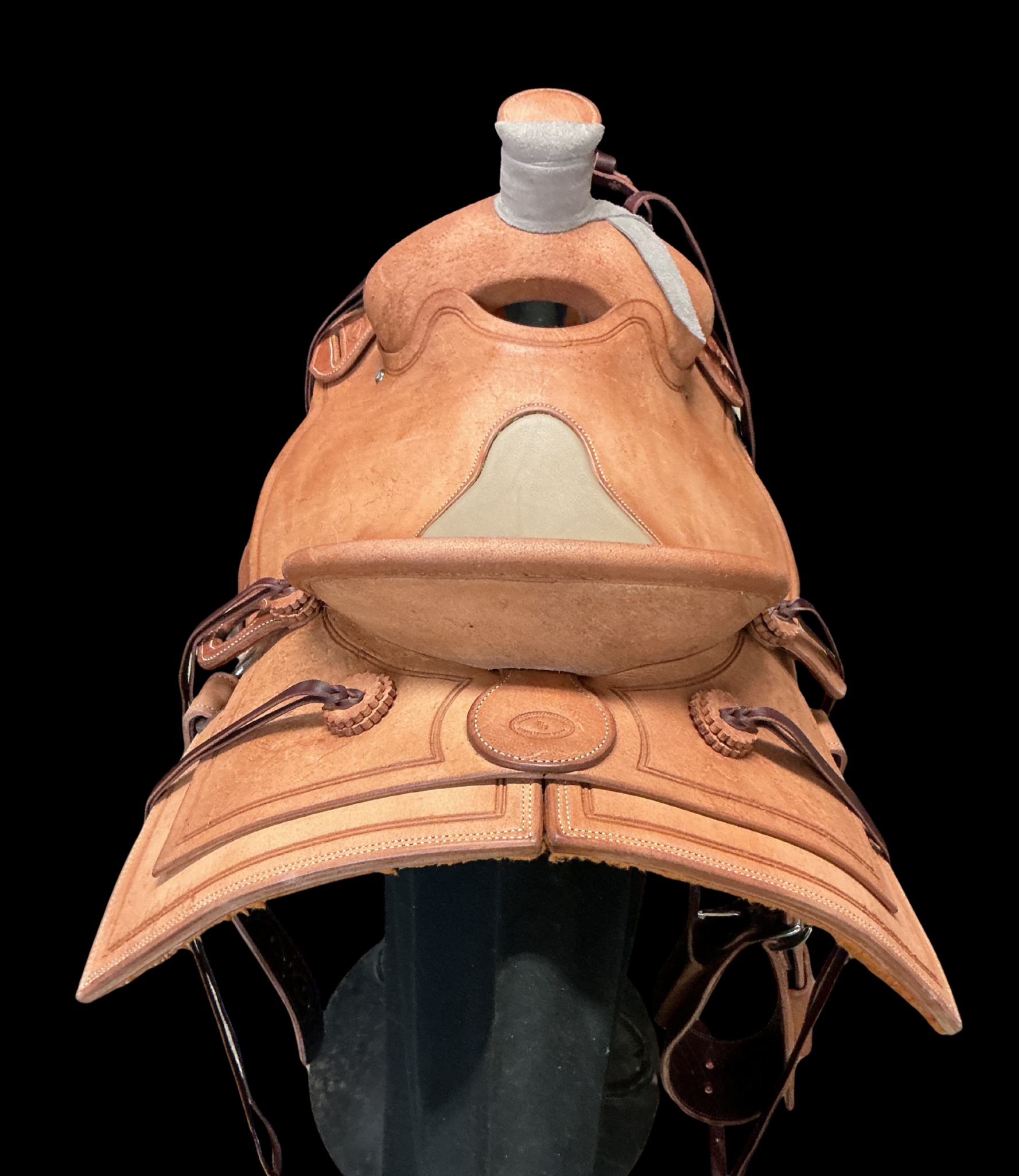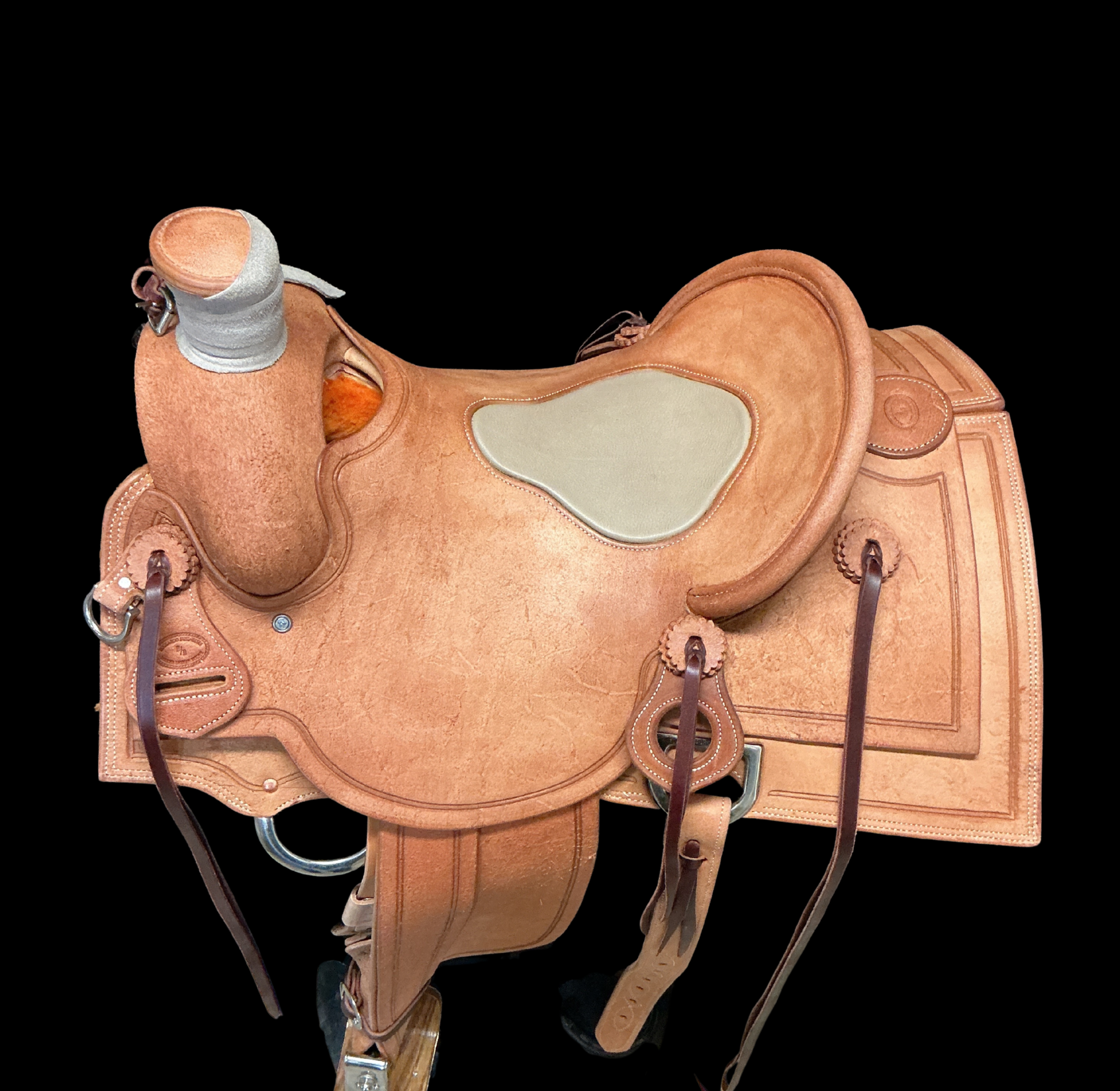 Custom built 15 1/2" Lieuallen saddle. Built on a 6 1/2" x 90° x 8" Swanke Tree. It is a full rough out with exposed stirrup leathers and an inlaid seat on square skirts with a Keetch horn. Includes your choice of cowboy stirrups, a front cinch and your choice of latigos and/or billets.