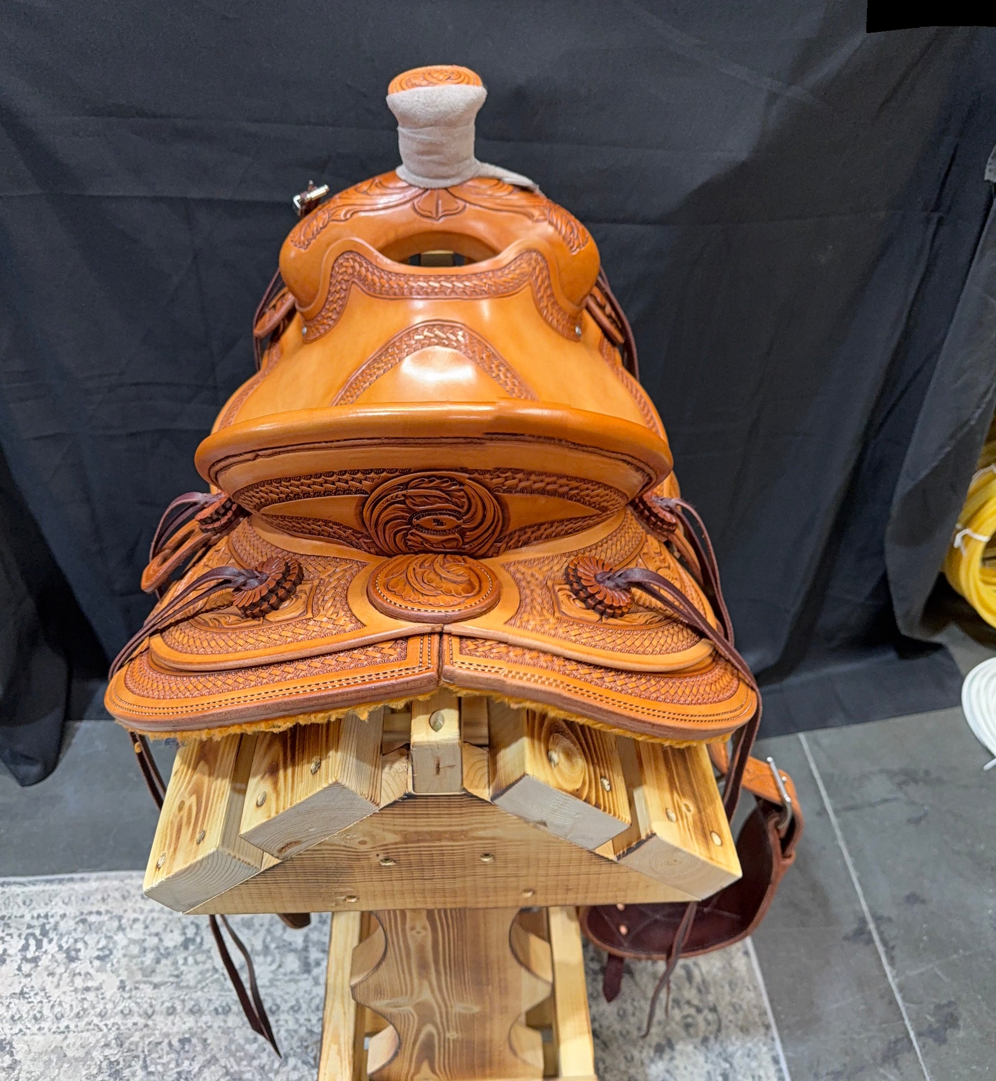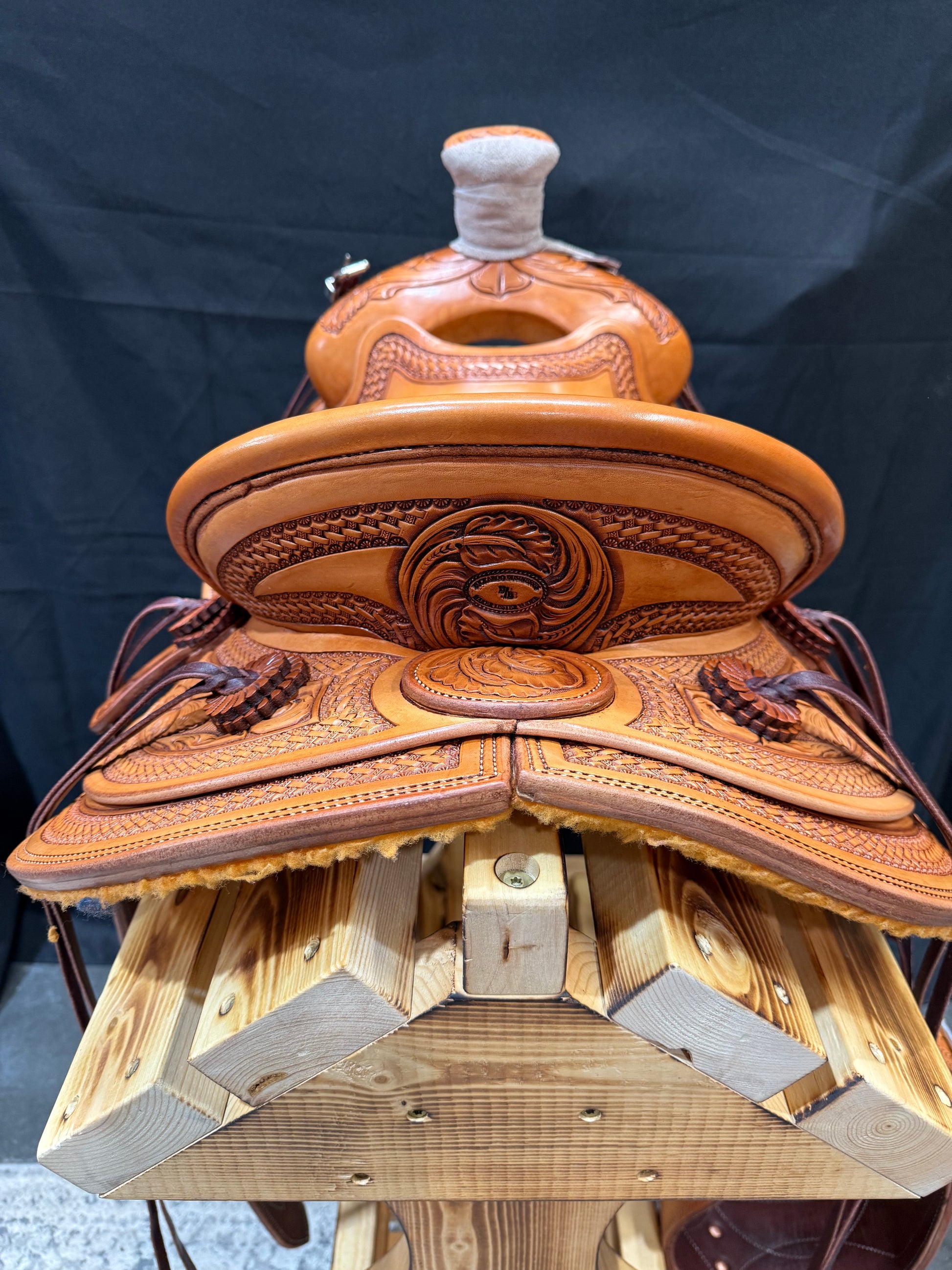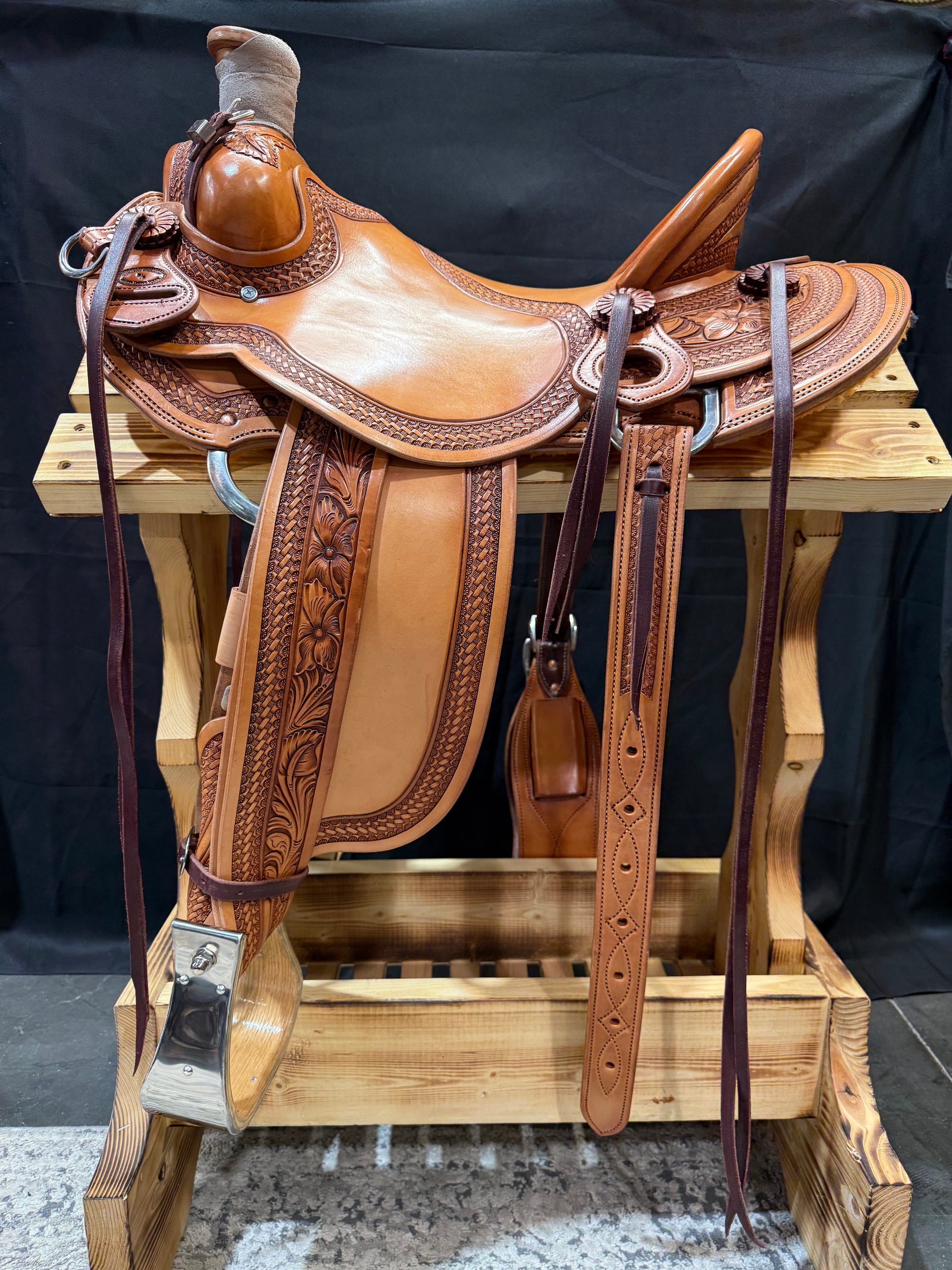 Custom built 15 1/2” Lieuallen saddle. Built on a 6 1/2" x 90° x 8" Swanke Tree with keetch horn. It is a smoothout with basket stamped border and flower combination, exposed stirrup leathers, and round skirts. It includes stirrups, a front cinch and your choice of latigos and/or billets.