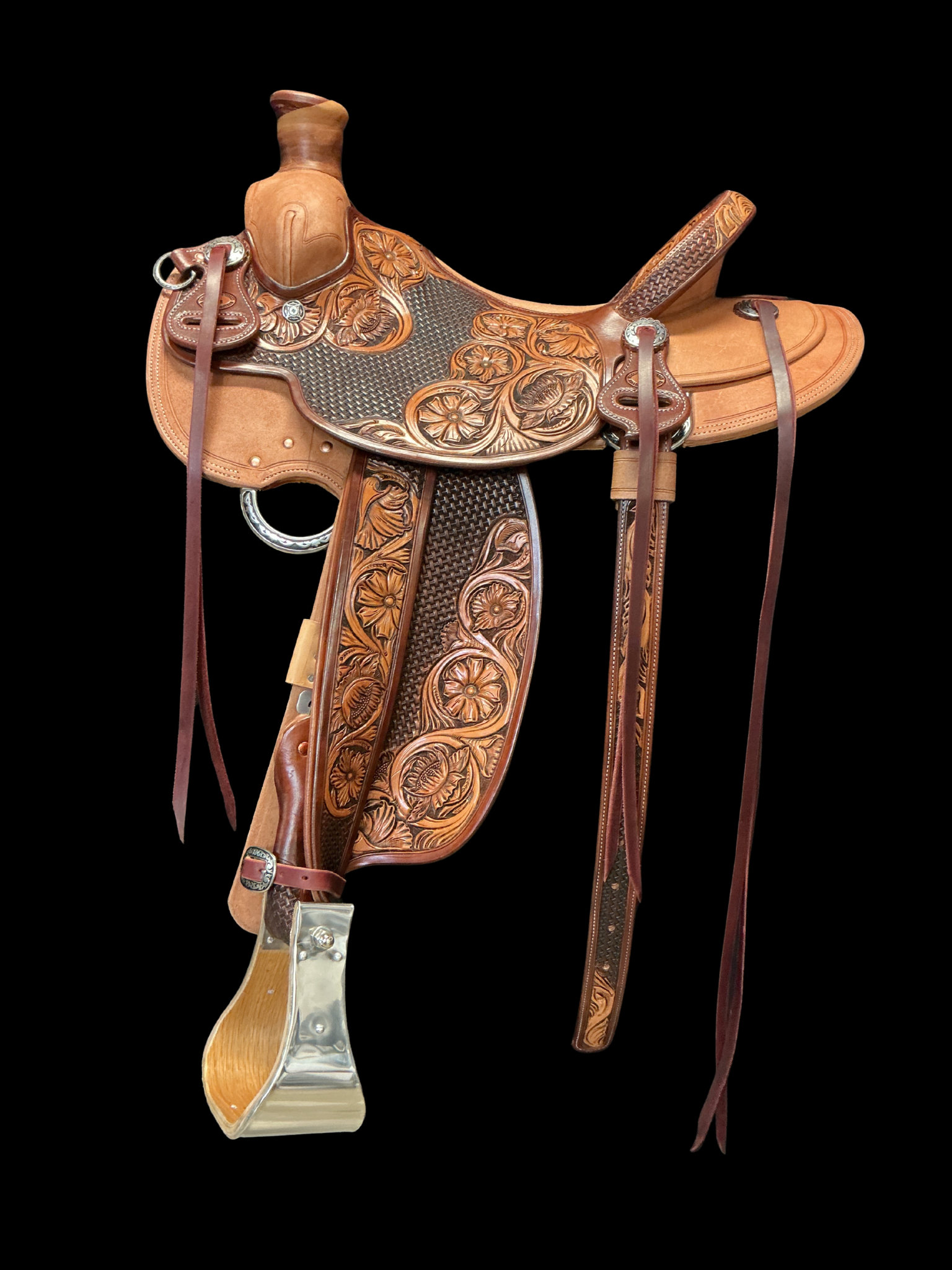 Custom built 15 1/2 T M Roper saddle. Built on a 6 1/2" x 90° x 7 3/4" Swanke Tree. It is a reverse half breed with dyed floral carving and basket stamping, an inlaid seat and exposed stirrup leathers on round skirts. It includes your choice of cowboy stirrups, a front cinch and your choice of latigos and/or billets.
