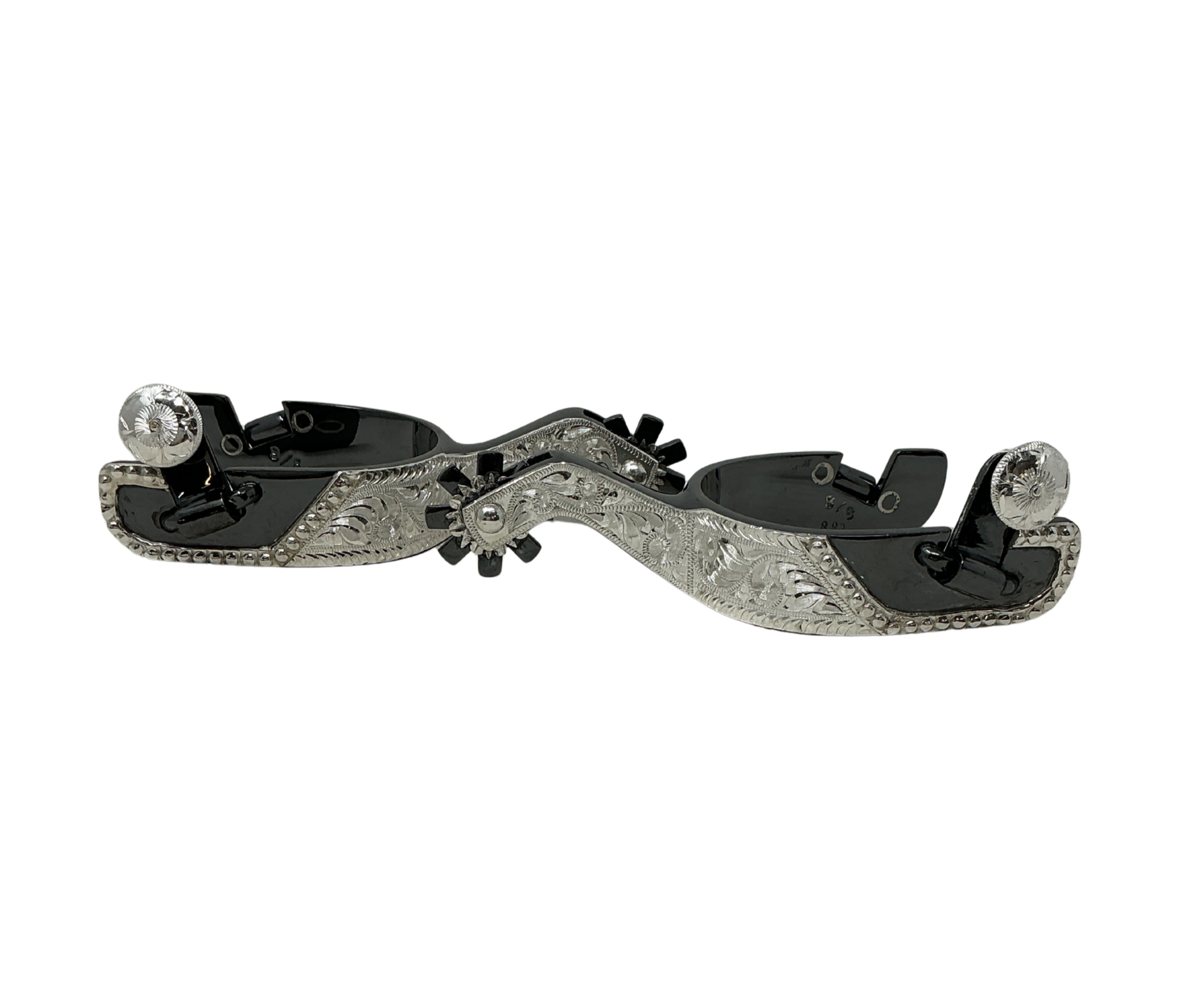 Black finish with overlaid sterling silver, silver dots and rowel discs. For custom orders, please visit B/B Silver Spurs- Custom Orders.