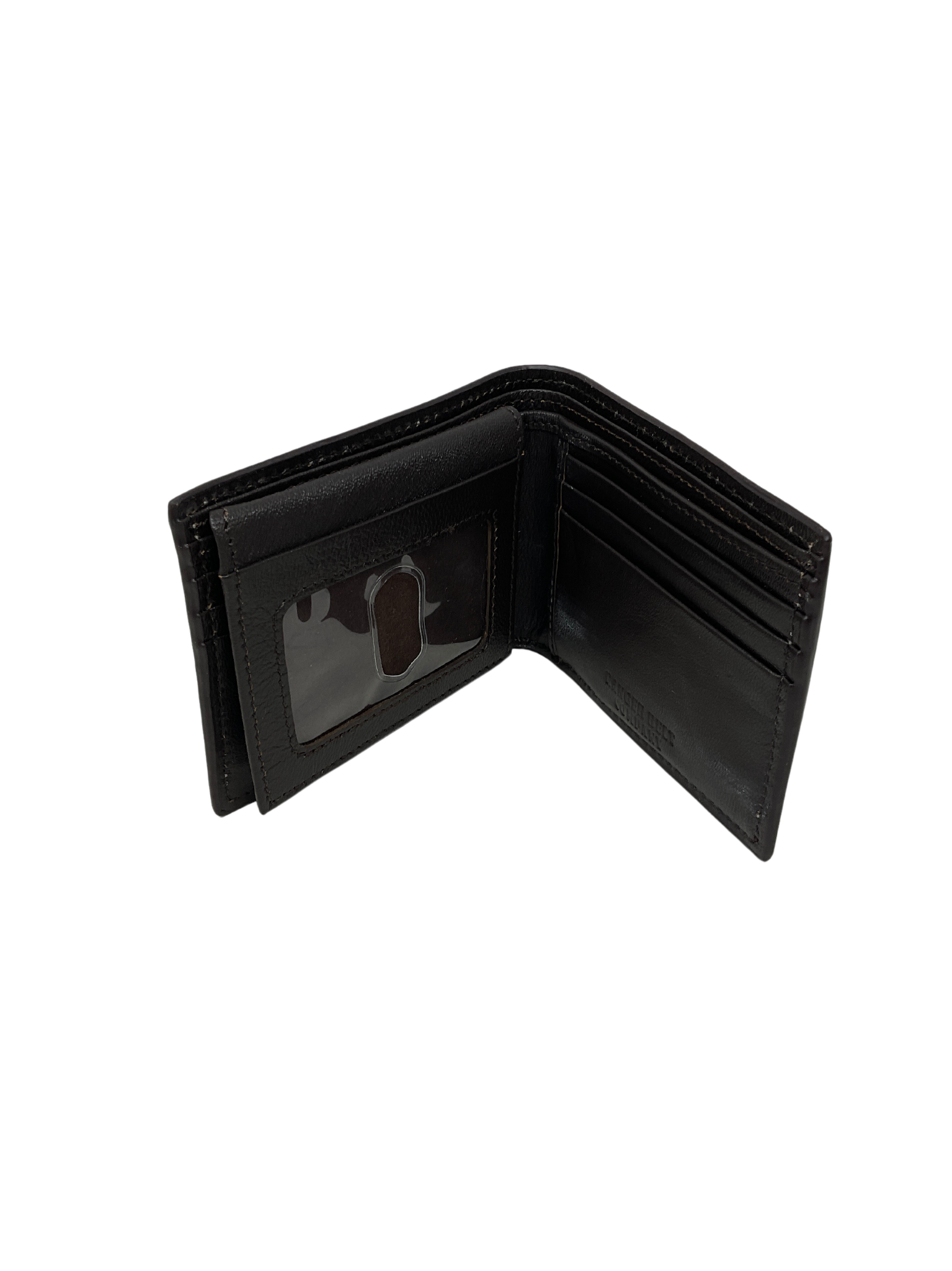 Dark basket stamped bifold wallet with an embroidered design. Measures 4 1/2" x 3 1/2". Inside has multiple pockets for cards and cash.
