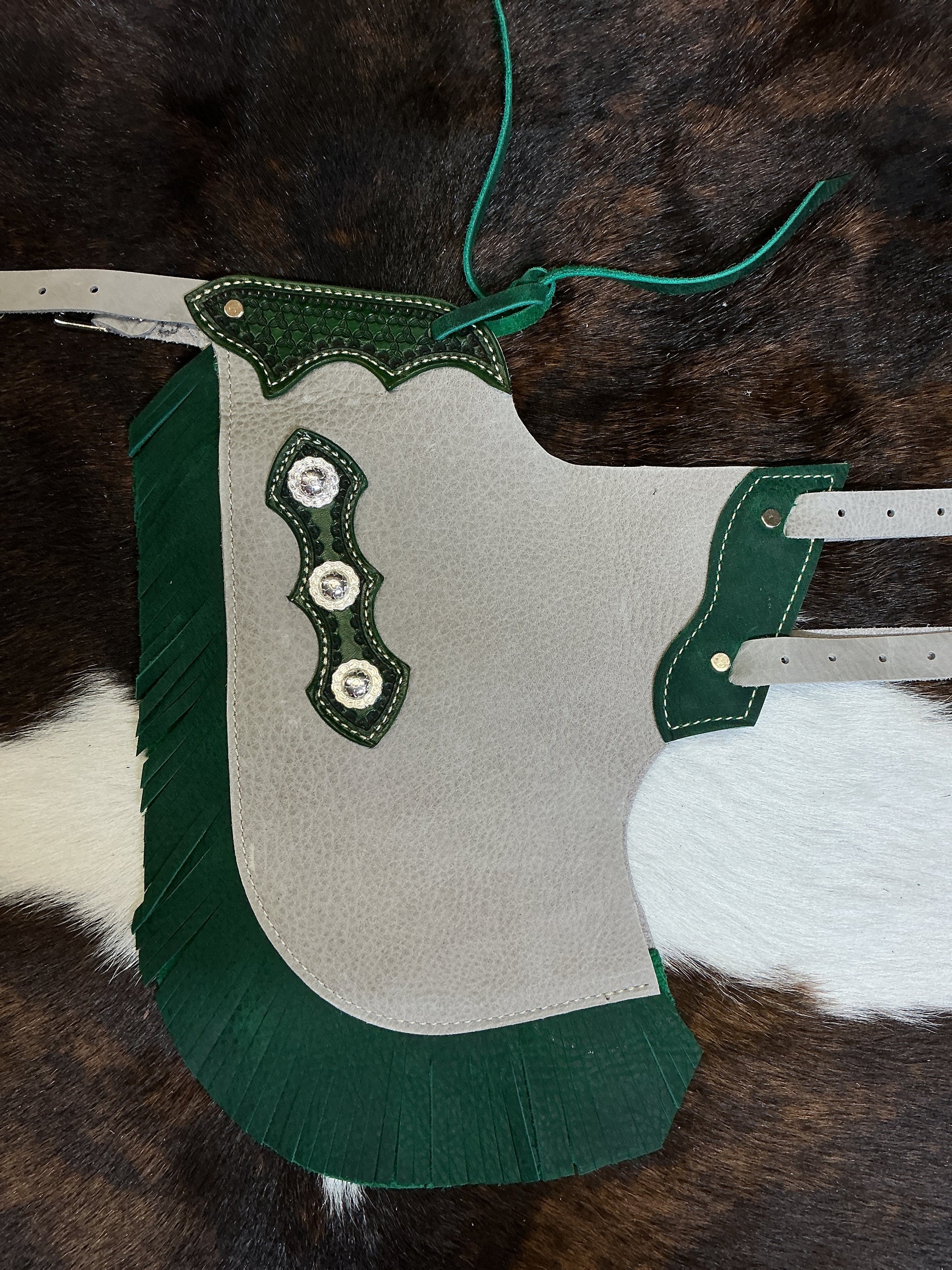 Superior quality, custom made B/B Chinks. Each pair is custom made here in Montana with premier leather. High quality USA made buckle on the back of the belt. 2 straps buckle around the thigh to hold them in place.