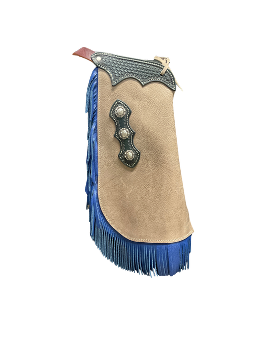 Superior quality, custom made B/B Chinks. Each pair is custom made here in Montana with premier leather. High quality USA made buckle on the back of the belt. 2 straps buckle around the thigh to hold them in place.