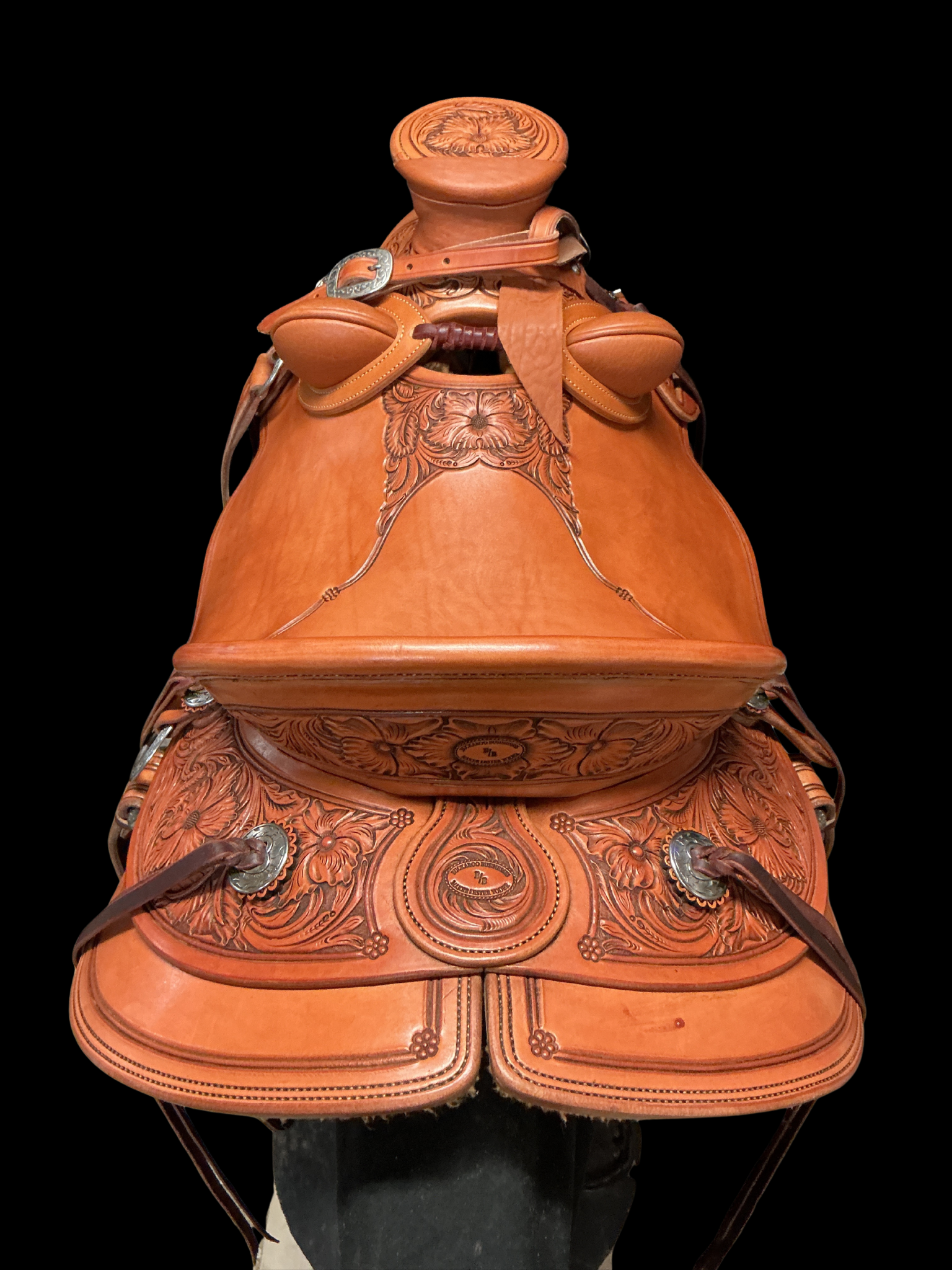 Gorgeous, never used B/B saddle built on a 6 1/4 x 90° x 7 3/4" Swanke Tree. It is a smooth out Ray Hunt Wade half breed saddle with floral carving and a double tickle line on round skirts. It has floral carved exposed stirrup leathers, a matching breast collar, matching 22" floral carved eagle beak tapaderos as well as a pair of 5" stainless covered stirrups. It comes with matching bucking rolls, 2 latigos on the front and a back cinch.