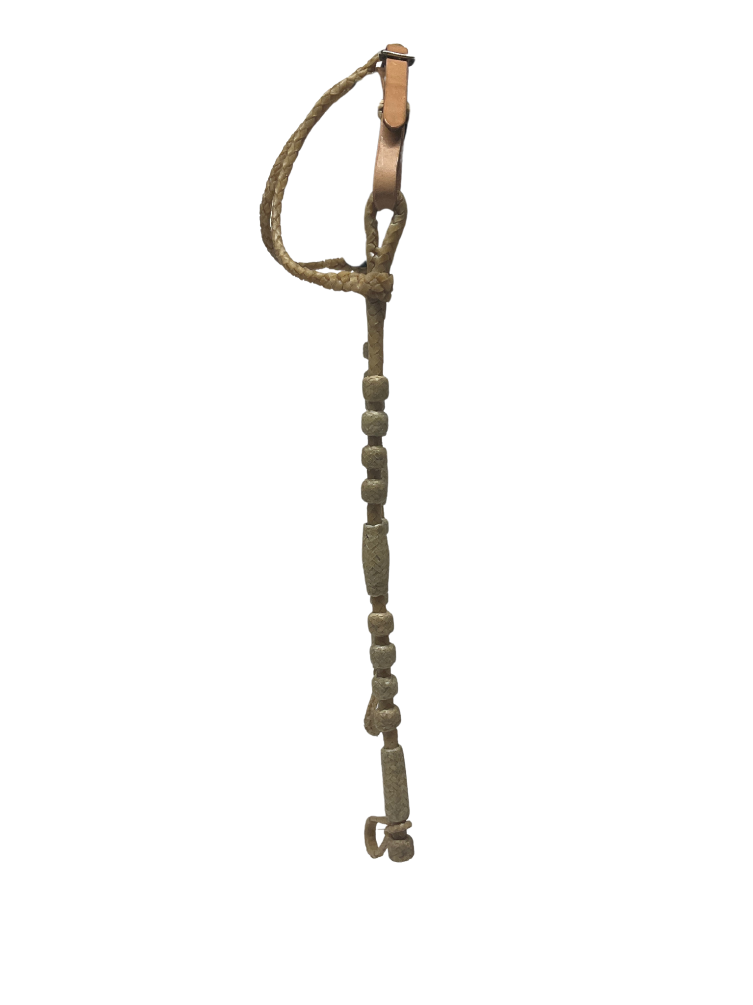 Hand braided rawhide double ear headstall. Adjustments are made with a leather strap on the crown. Available in Oklahoma or California button patterns.