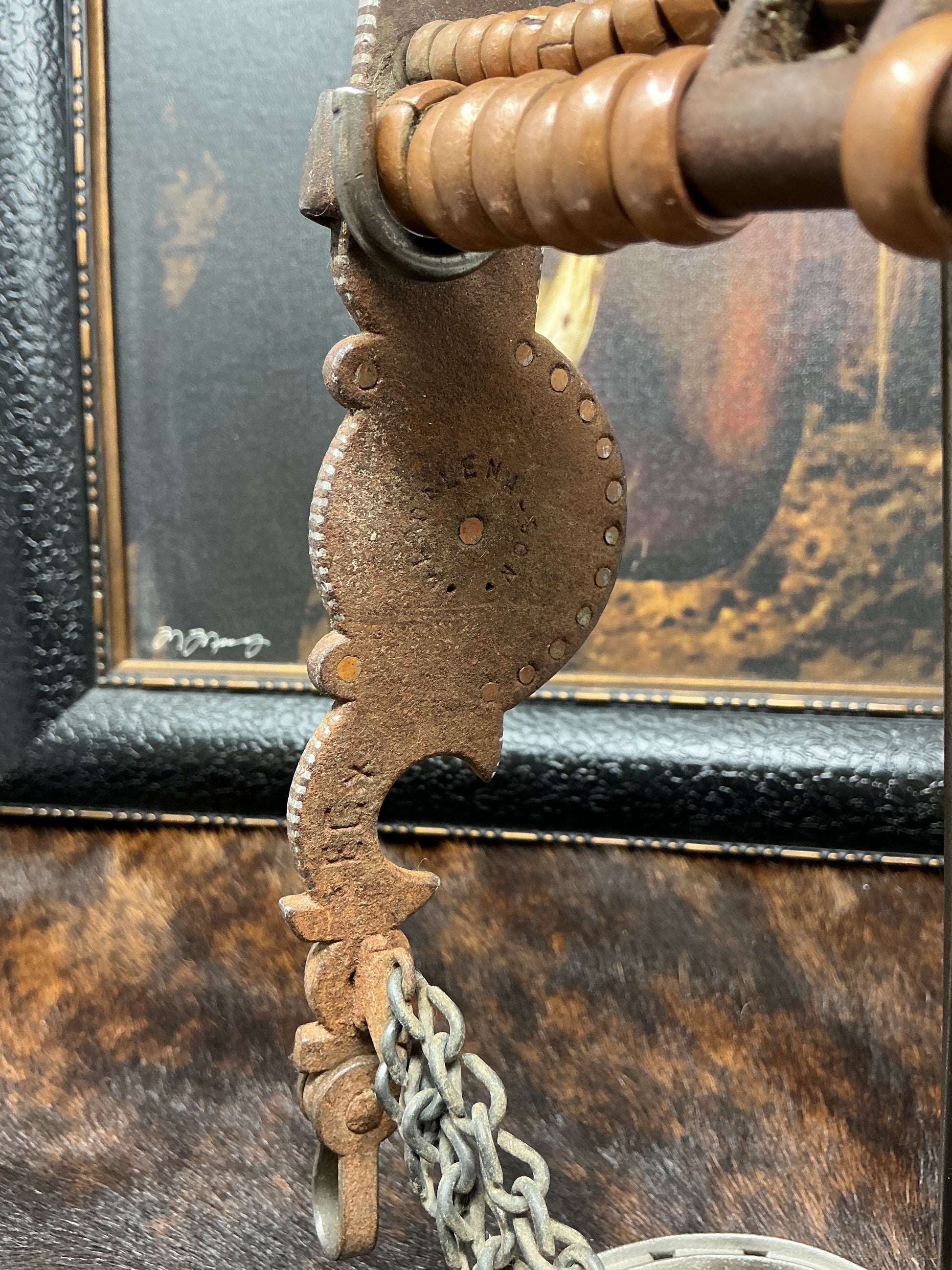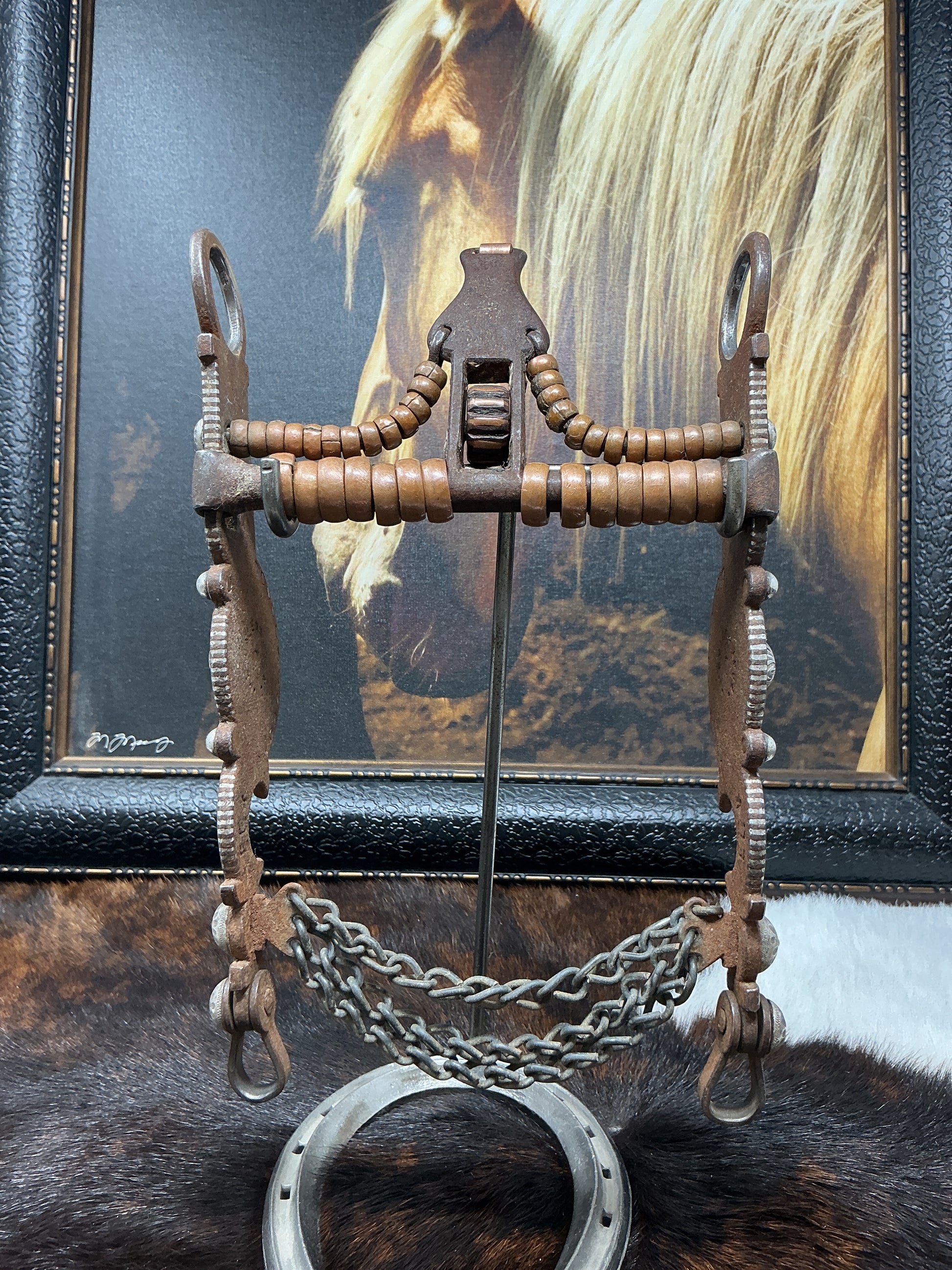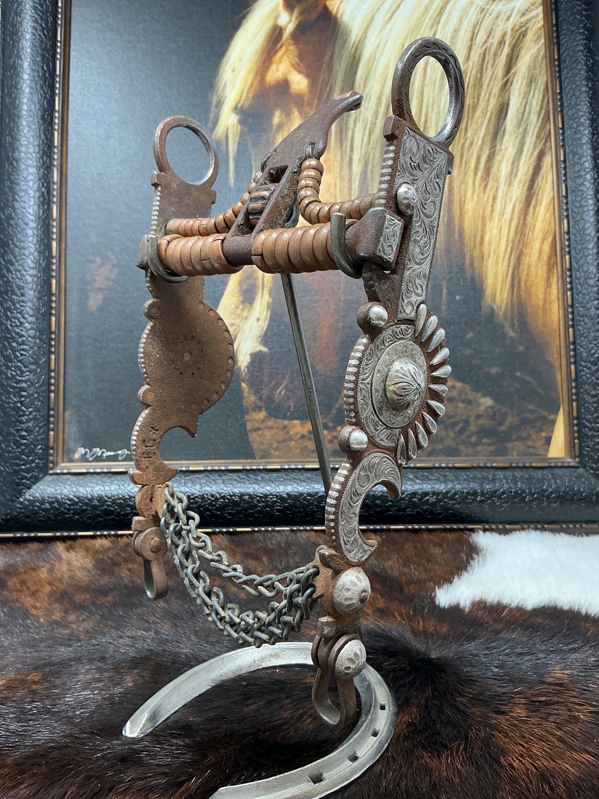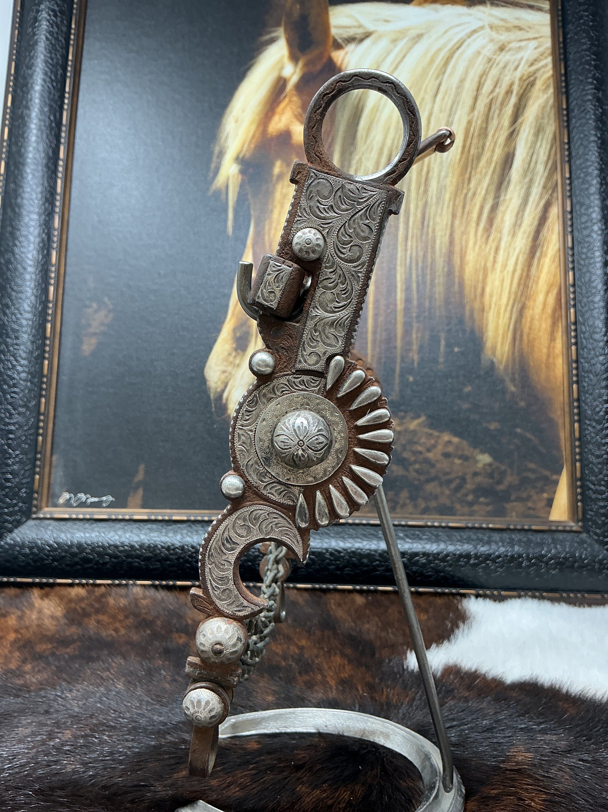 E.G.* spade bit with inlaid sterling silver and slobber chains. The mouth 5 1/8" wide and it has a 3 3/4" tall spade. It is marked EG* on both cheeks and Magdalena Mexico, 1988.