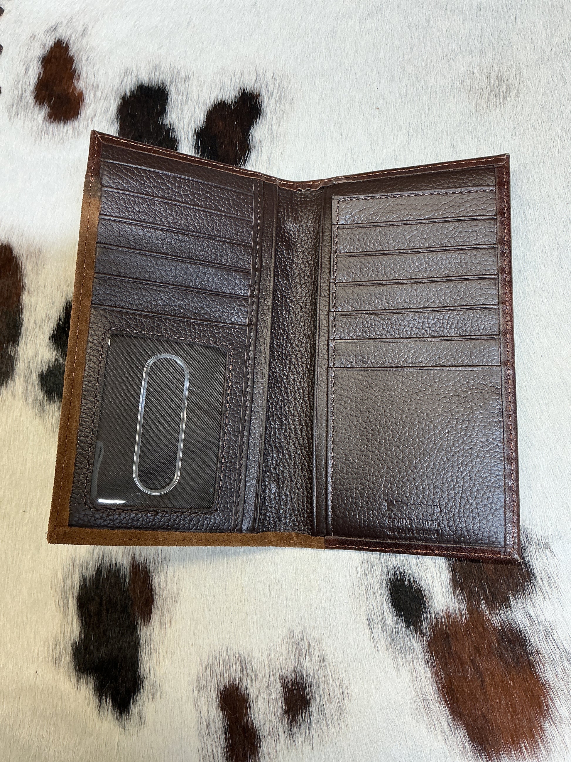 Roughout checkbook wallet with a floral carved accent piece and buck stitching. Measures 7“x 4“. Inside has multiple pockets for cards and long pockets for cash or a checkbook.