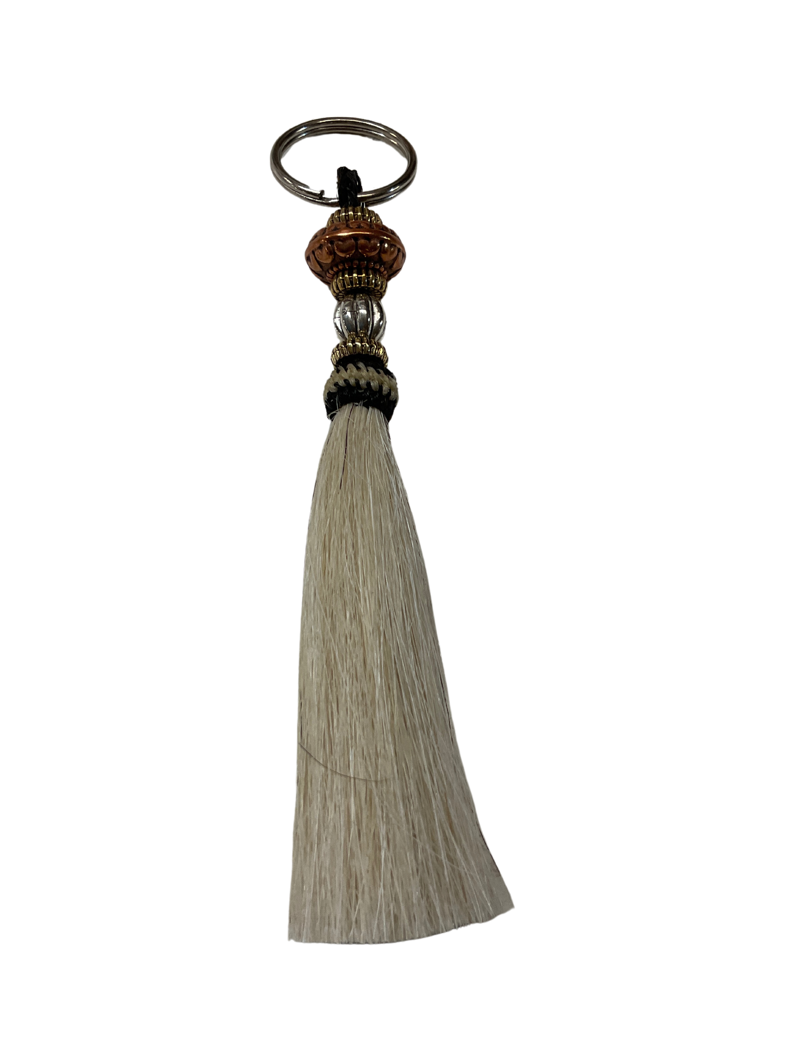 Keychain made from a horsehair tassel with decorative beads. 5" total length. Available in a variety of colors.