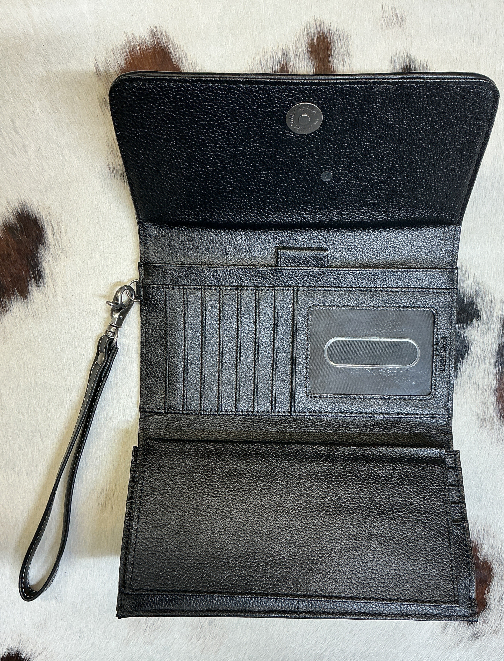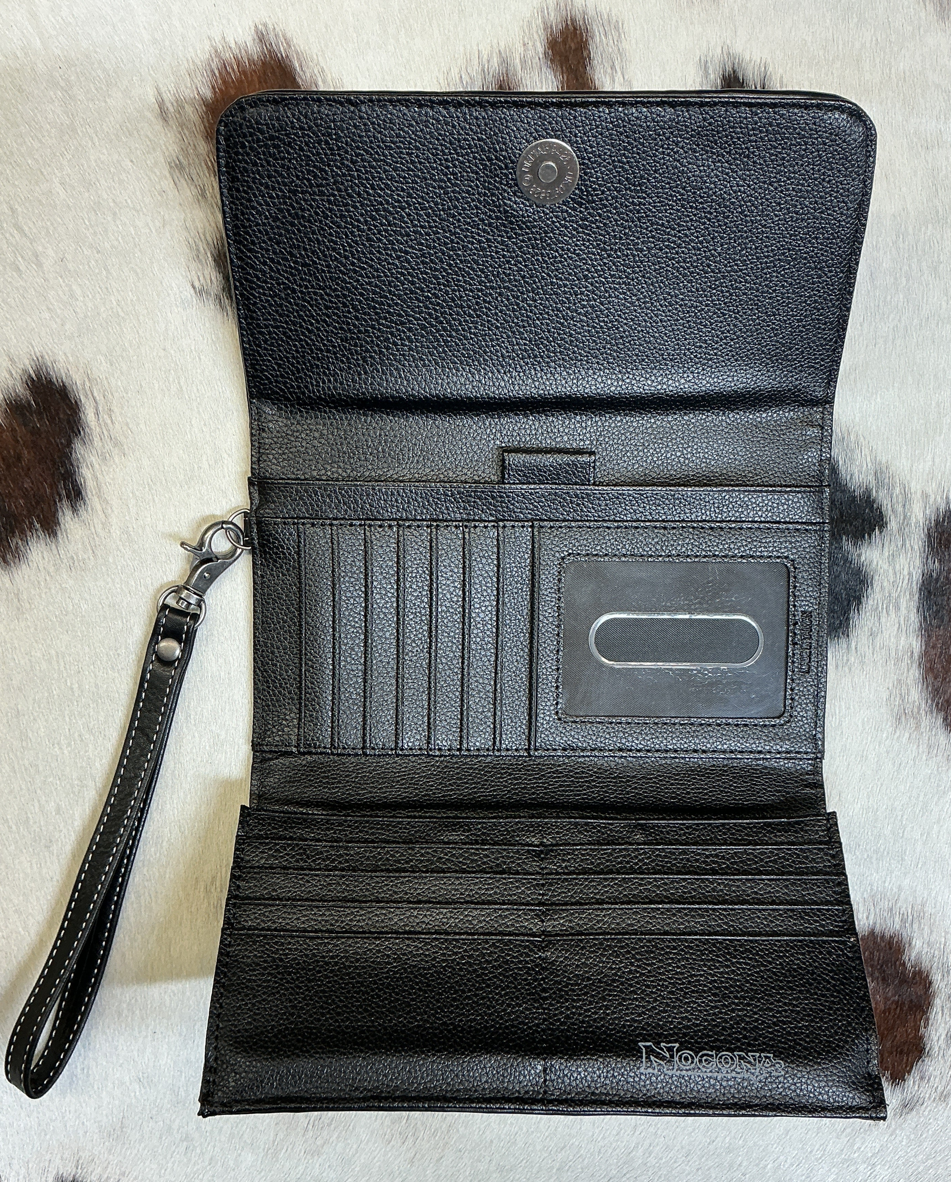 Ladies clutch wallet made with black leather and a cloth tapestry design on the front. It has card slots, a cash slot, a checkbook cover, a photo id slot and a zipper coin pocket on the back with a wrist strap. Measures 7 1/2" x 4 1/2".