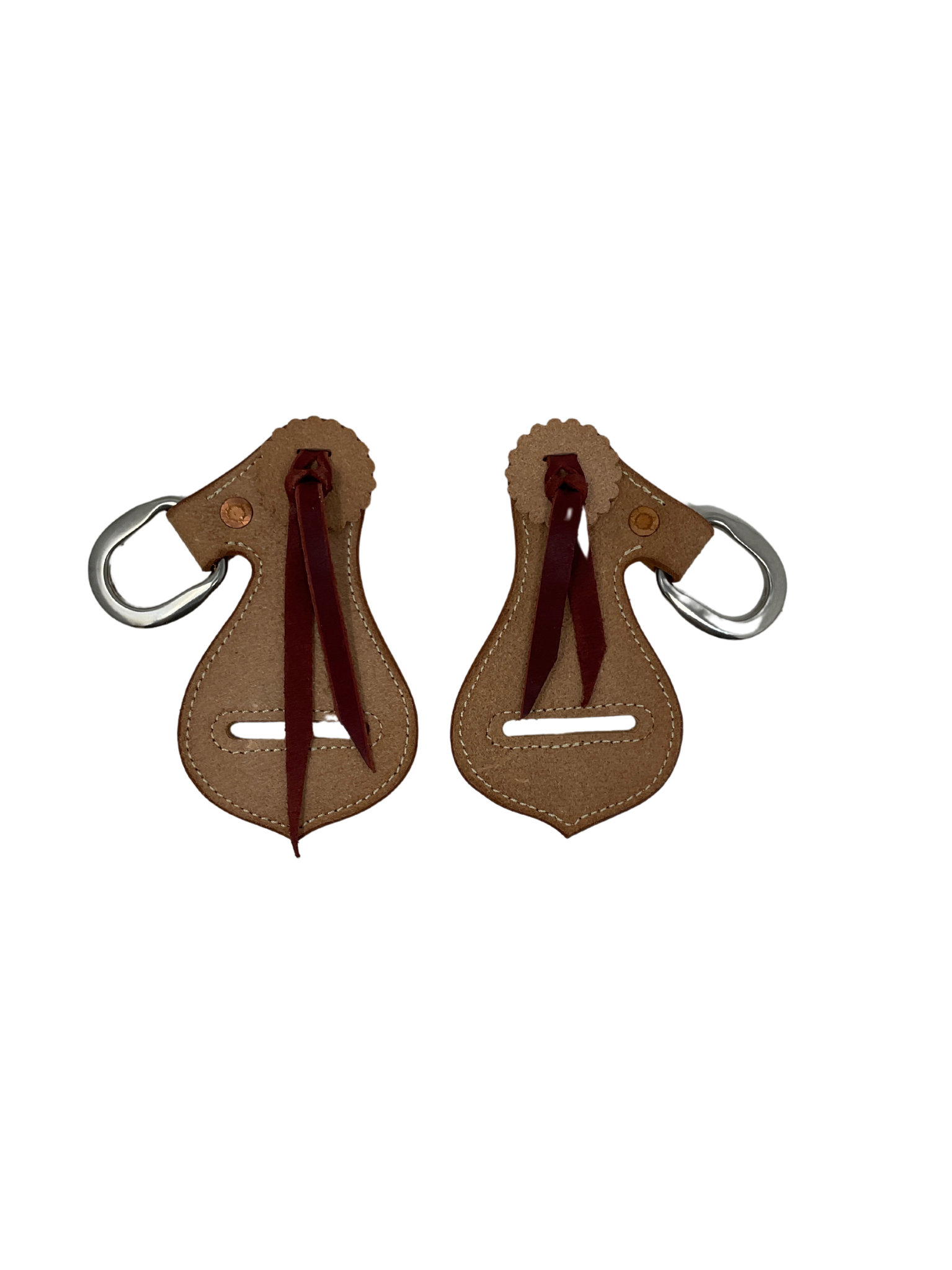 Doubled and stitched latigo keeper with leather rosette and d-ring. Sold as a pair. Available in roughout or smoothout.