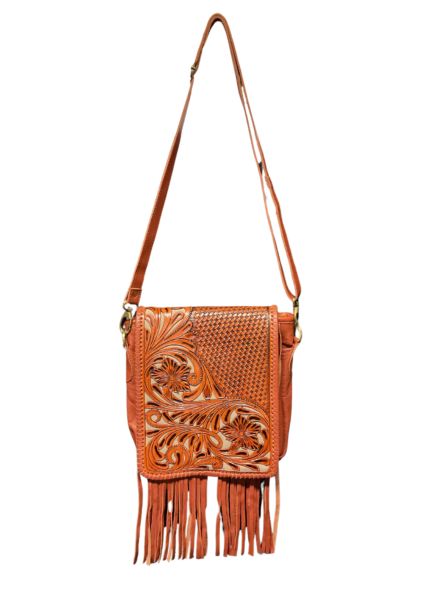 Light colored, soft leather purse with floral filigree against a gray background. Large interior pocket with 3 small inside pockets and it has both a zipper and a magnetic clasp closure. It has an adjustable shoulder strap that can go from 32" long up to 60". Measures 12" x 10" x 2 1/2".