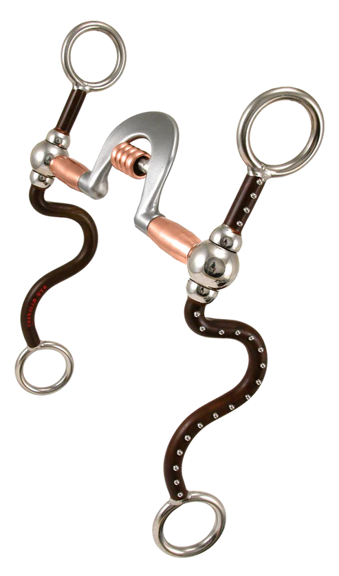 This beautifully crafted bit features a Long S Ballhinge shank in an antique brown finish with stainless dots. The mouthpiece is our Equalizer© with an inset copper roller. This shank measures 8 1/4".