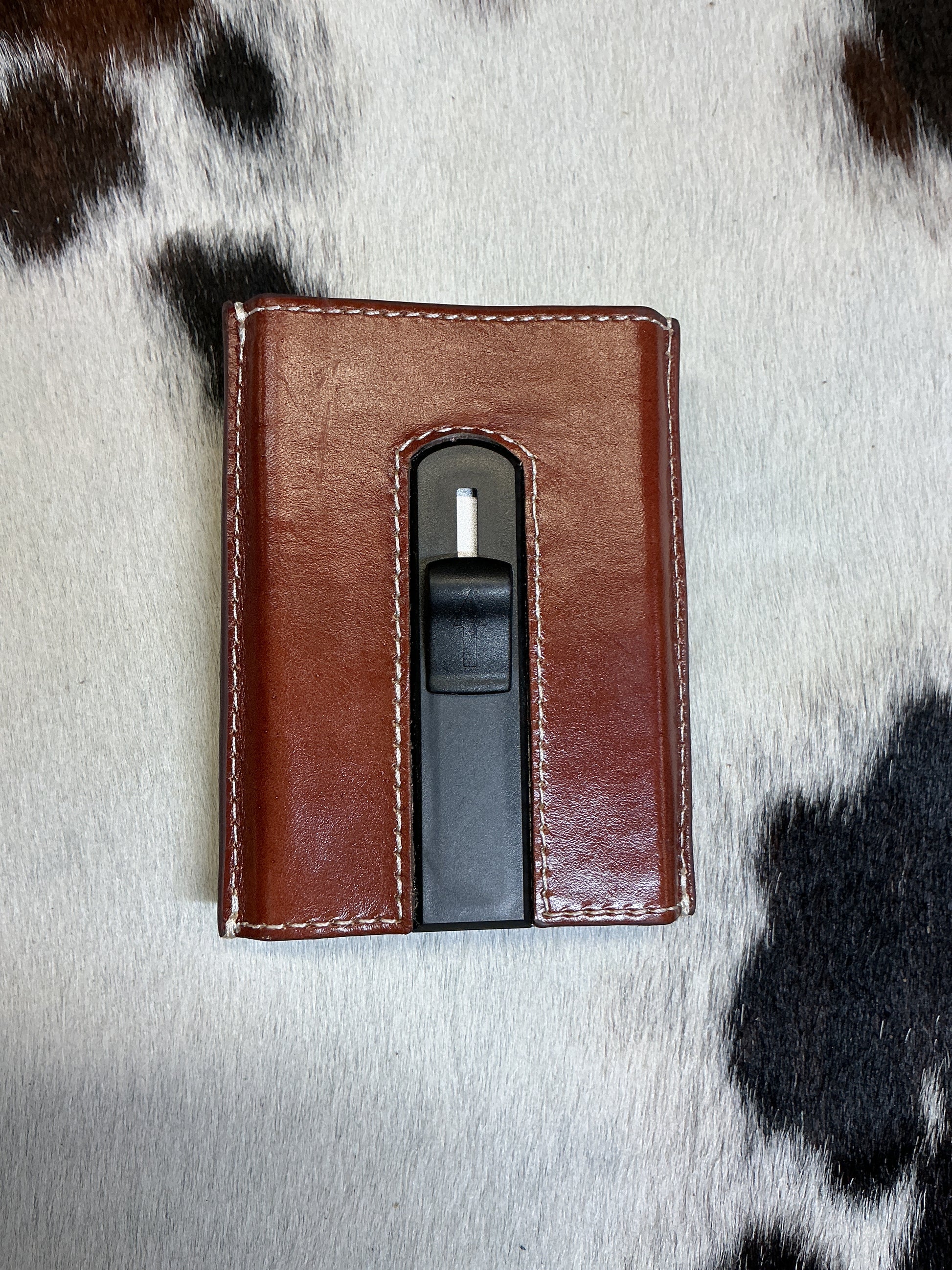 Leather covered aluminum alloy body and money clip credit card RFID wallet. It has floral carving and a slide to push up the cards. Holds up to 6 cards. It measures 3“ x 4“.